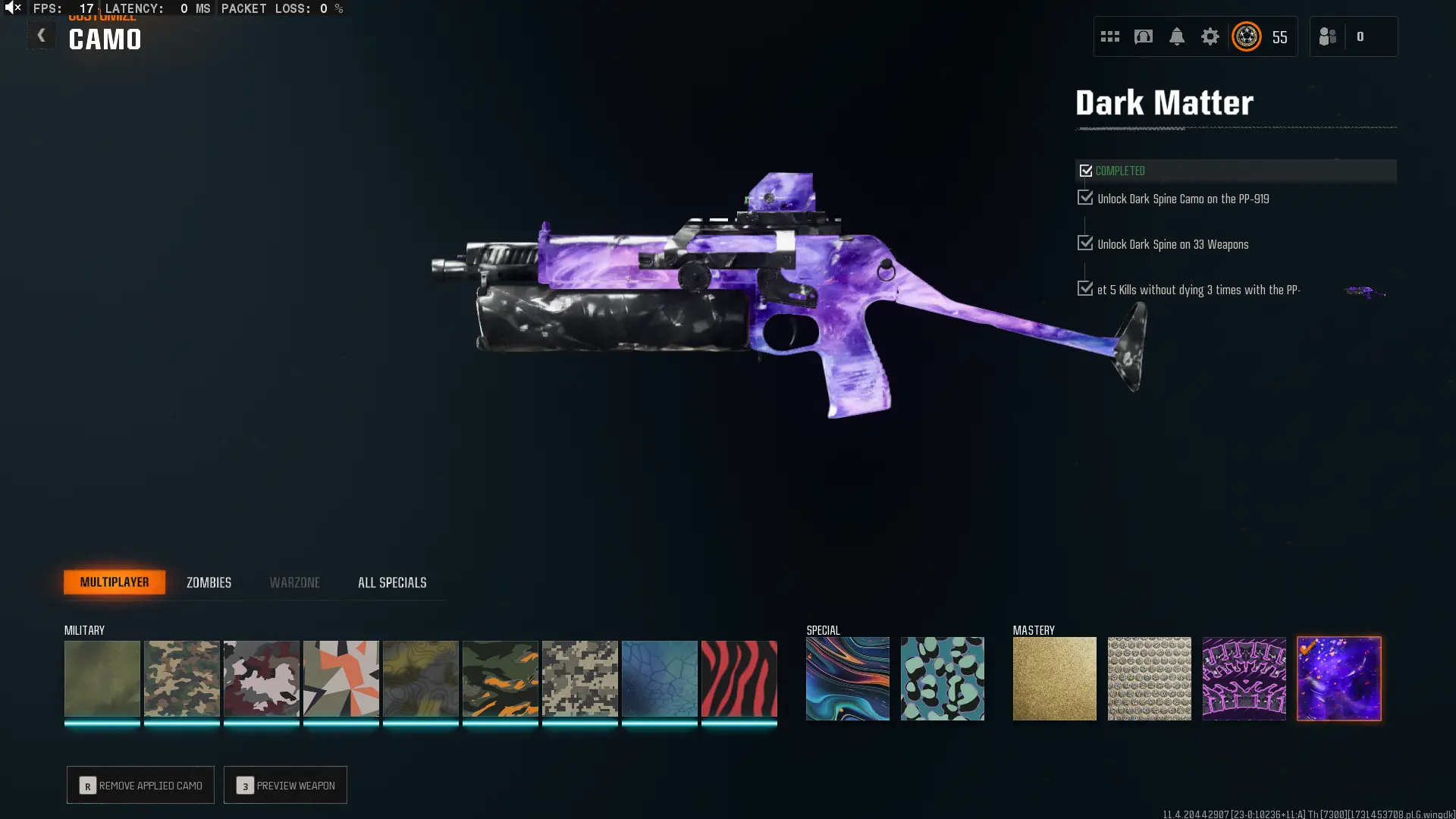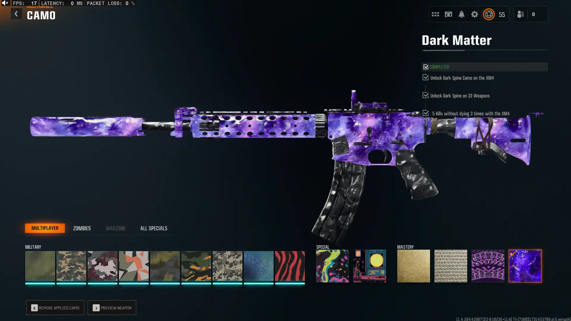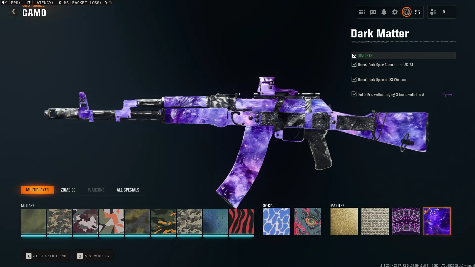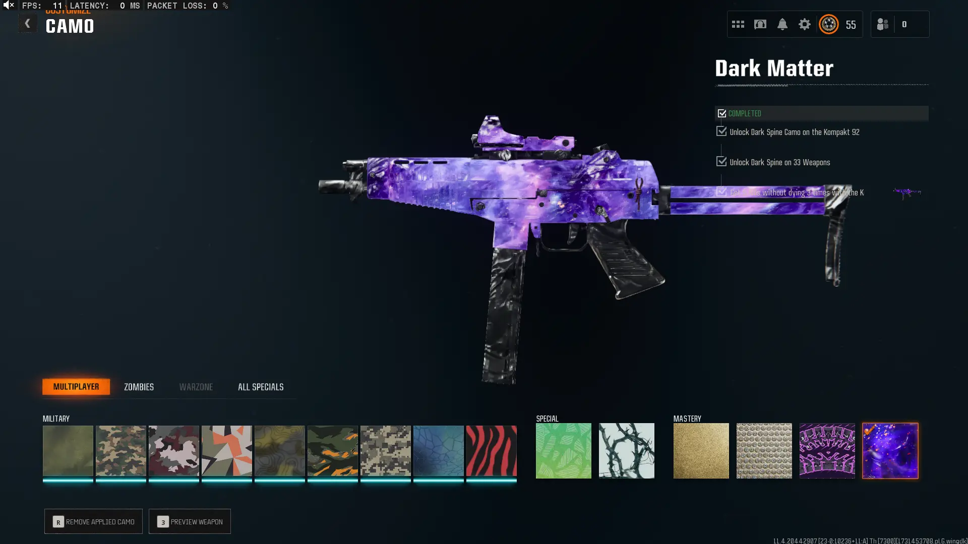 🌌 BO6 & Warzone 🌌 33 Dark Matter 🐉Prestige 4 🌌 459 Camos⚔️ Level 55 🔥 16 Operators 🕸️ Dark Spine 💎 Diamond✨ Gold Camos 🦾 Prestige-Ready🦾 Linkable to: Steam, Battle.net, PSN, Xbox 🌐 Black Ops 6