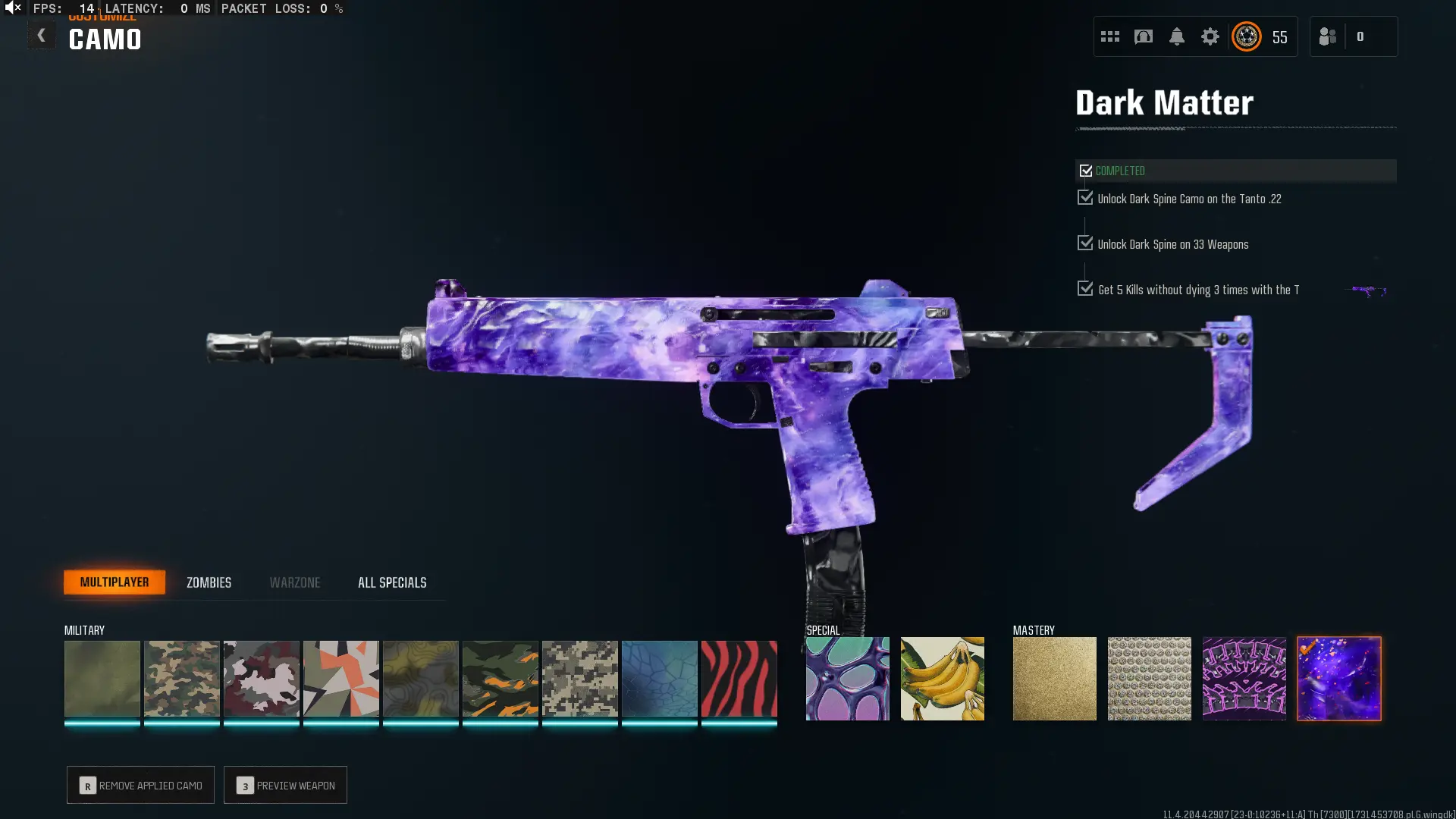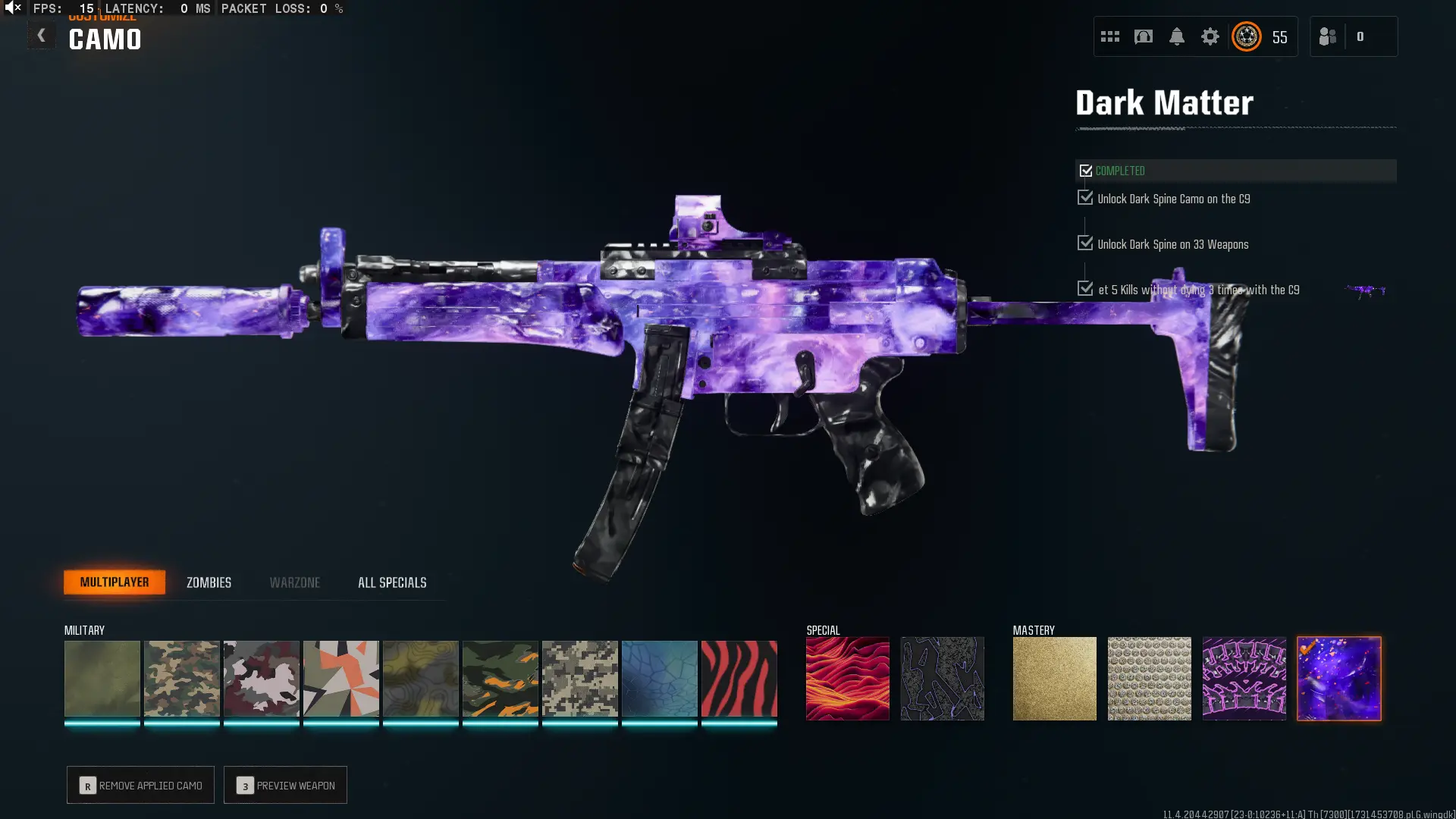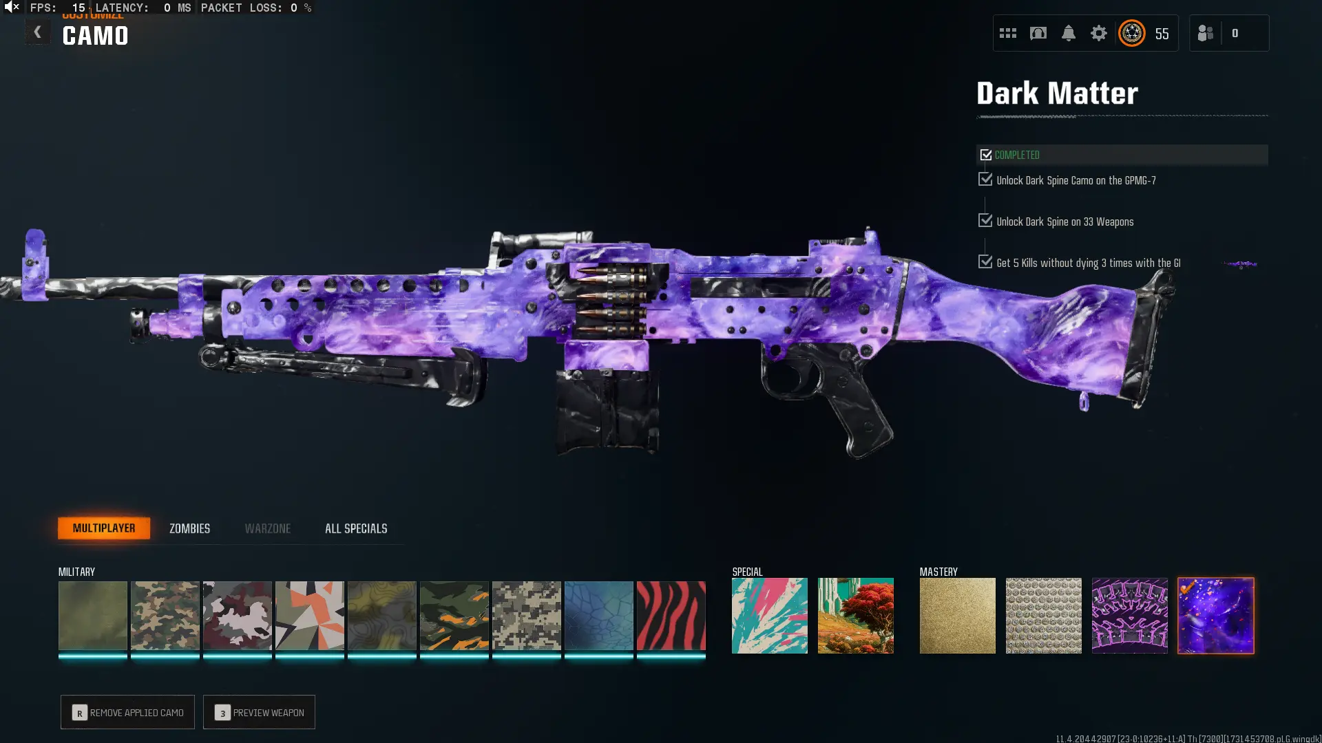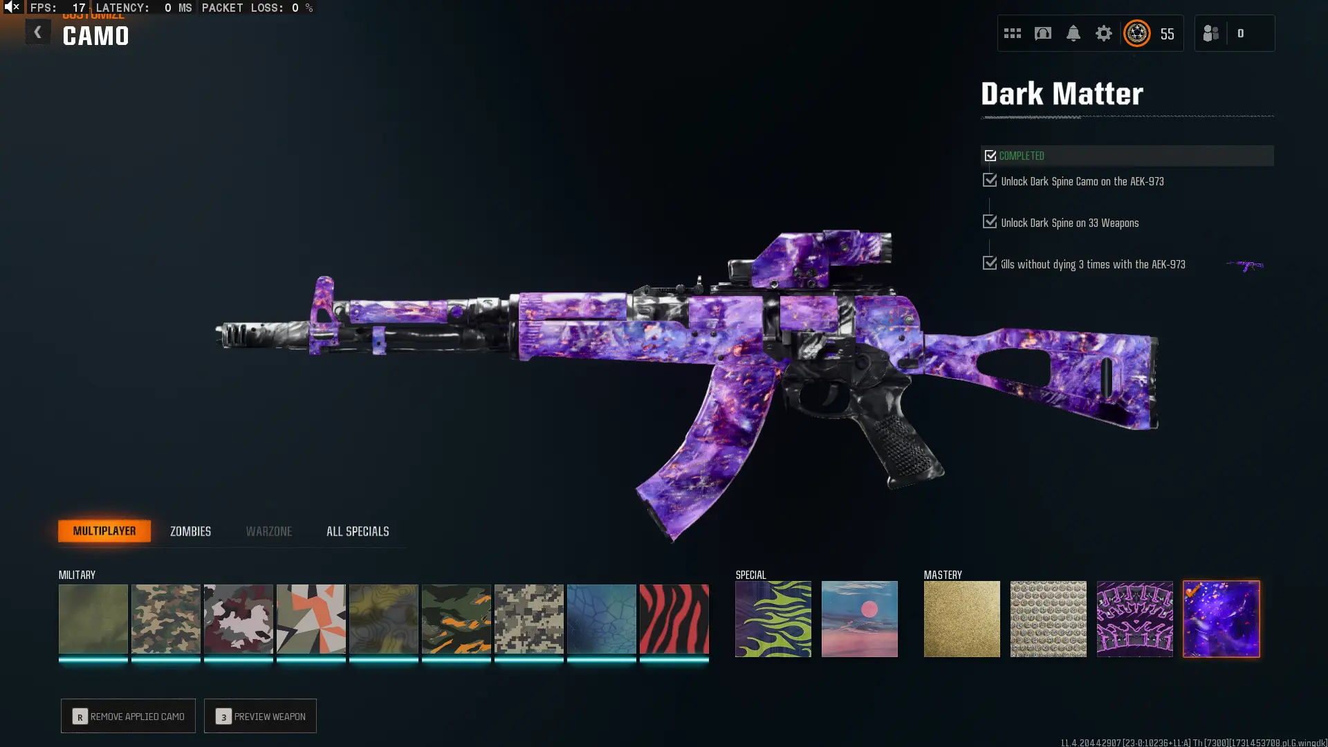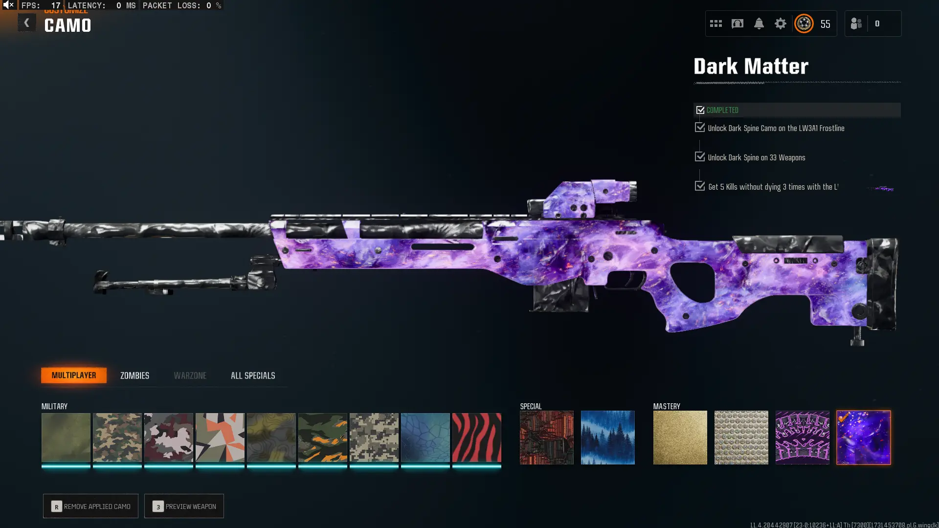 🌌 BO6 & Warzone 🌌 33 Dark Matter 🐉Prestige 4 🌌 459 Camos⚔️ Level 55 🔥 16 Operators 🕸️ Dark Spine 💎 Diamond✨ Gold Camos 🦾 Prestige-Ready🦾 Linkable to: Steam, Battle.net, PSN, Xbox 🌐 Black Ops 6