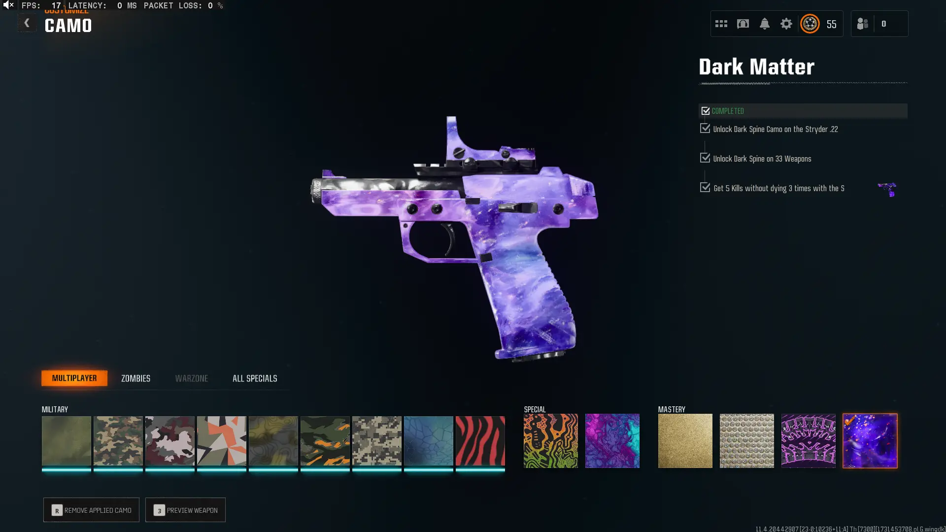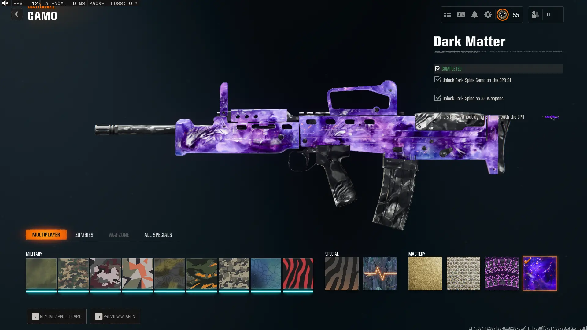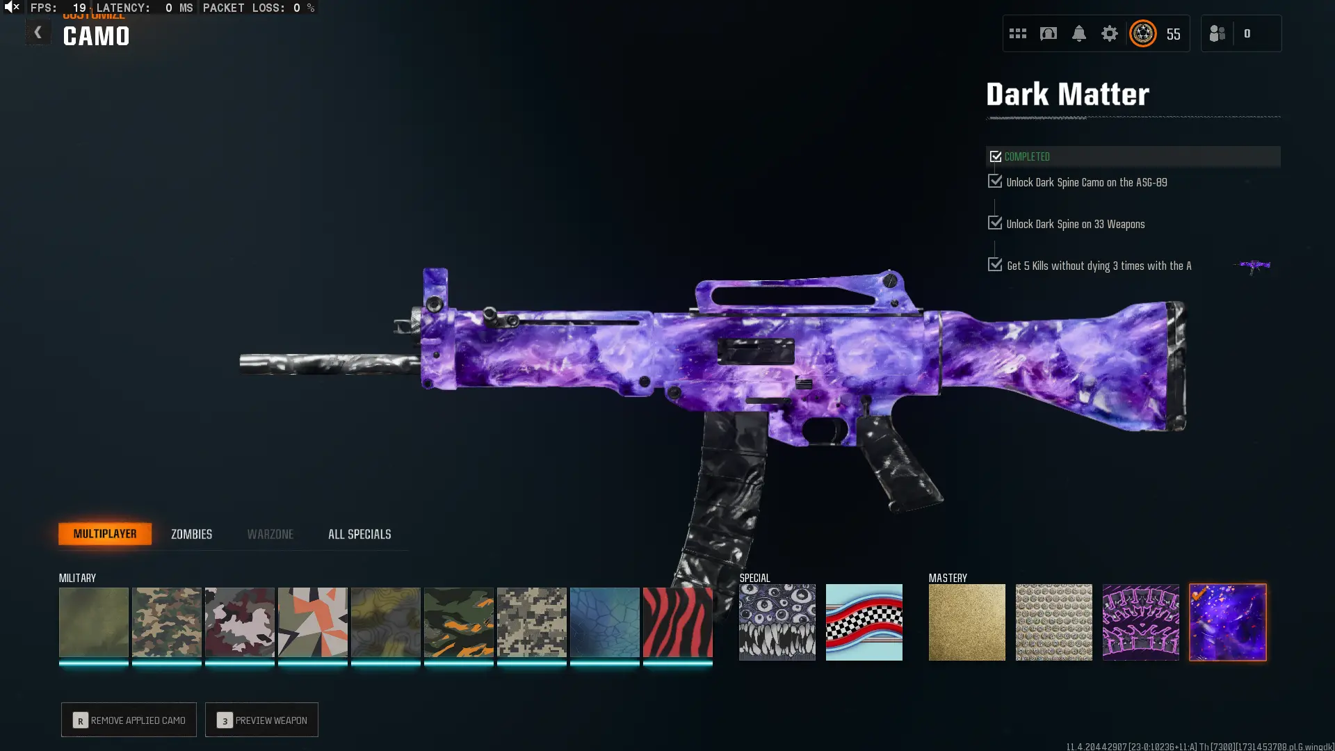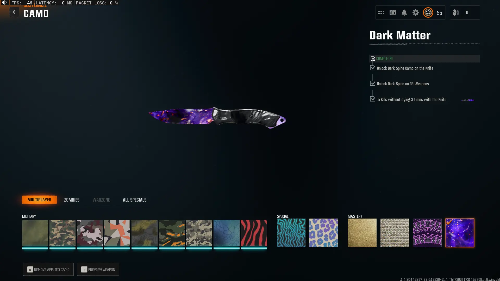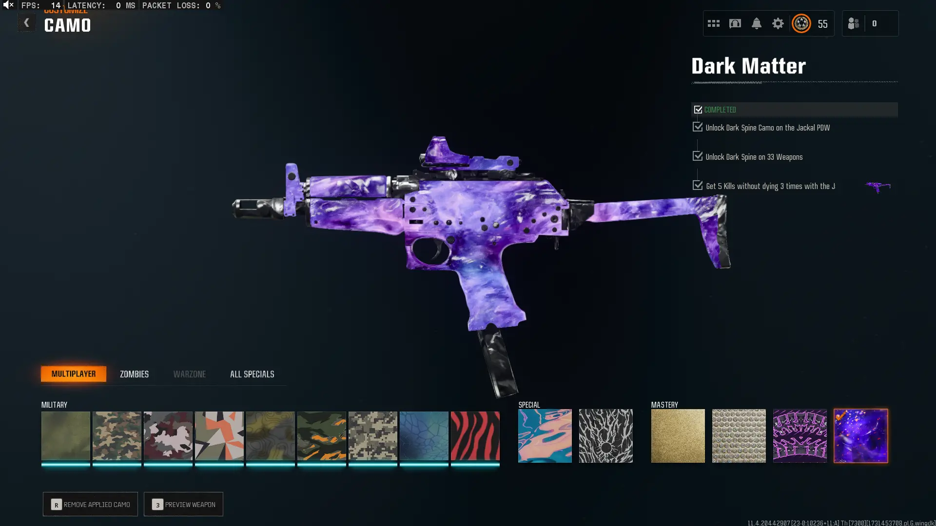 🌌 BO6 & Warzone 🌌 33 Dark Matter 🐉Prestige 4 🌌 459 Camos⚔️ Level 55 🔥 16 Operators 🕸️ Dark Spine 💎 Diamond✨ Gold Camos 🦾 Prestige-Ready🦾 Linkable to: Steam, Battle.net, PSN, Xbox 🌐 Black Ops 6
