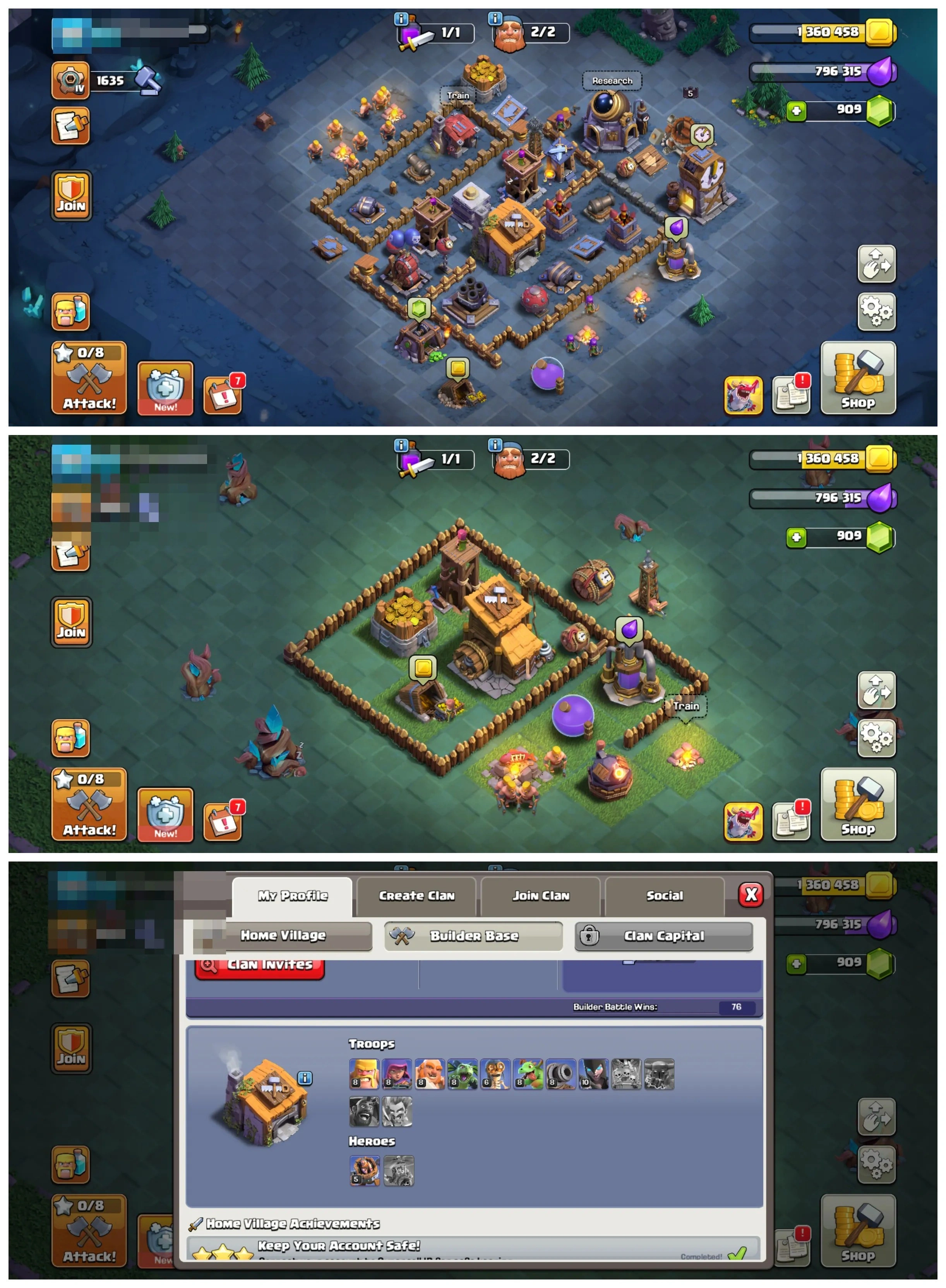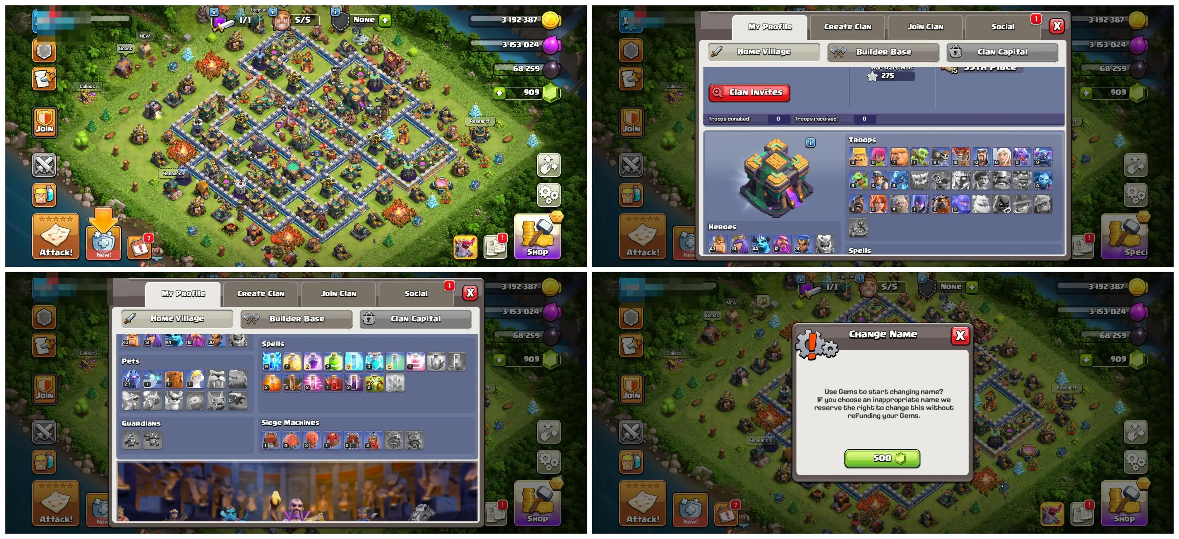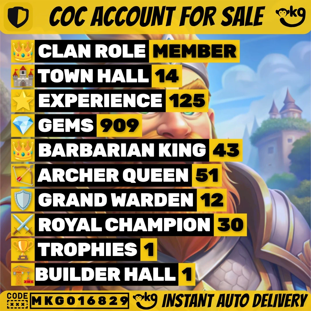 🏰 TH14 🏗️ Semi Max | 💎 909 Gems | 📈 Lvl 125 | 🦸♂️ Heroes 43/51/44/12/30 | 👕 — | ⚔️ 3 Epic Eq. | 💰 Nc 500 | 📱 Android/iOS | 🆔 M3745 !MKG016829