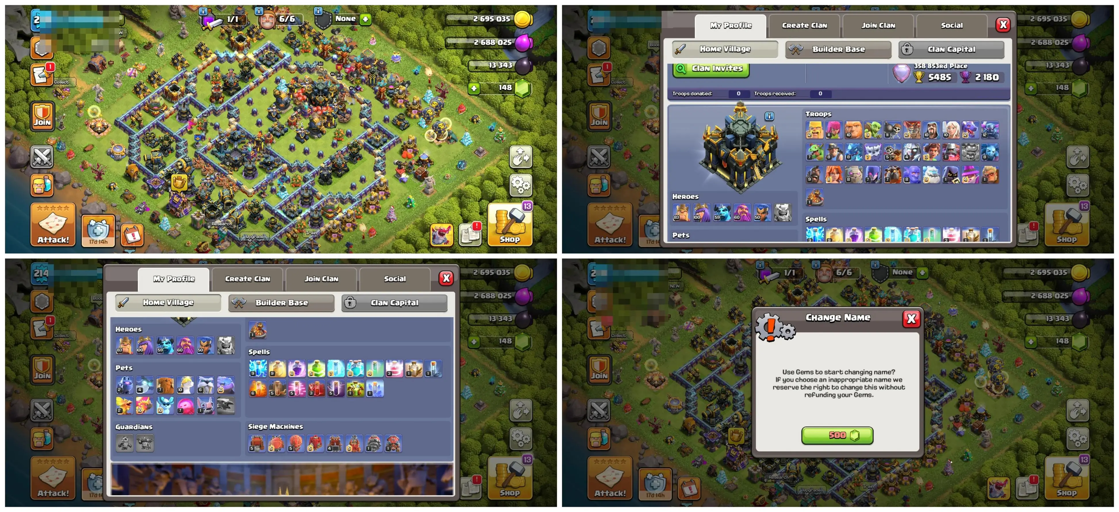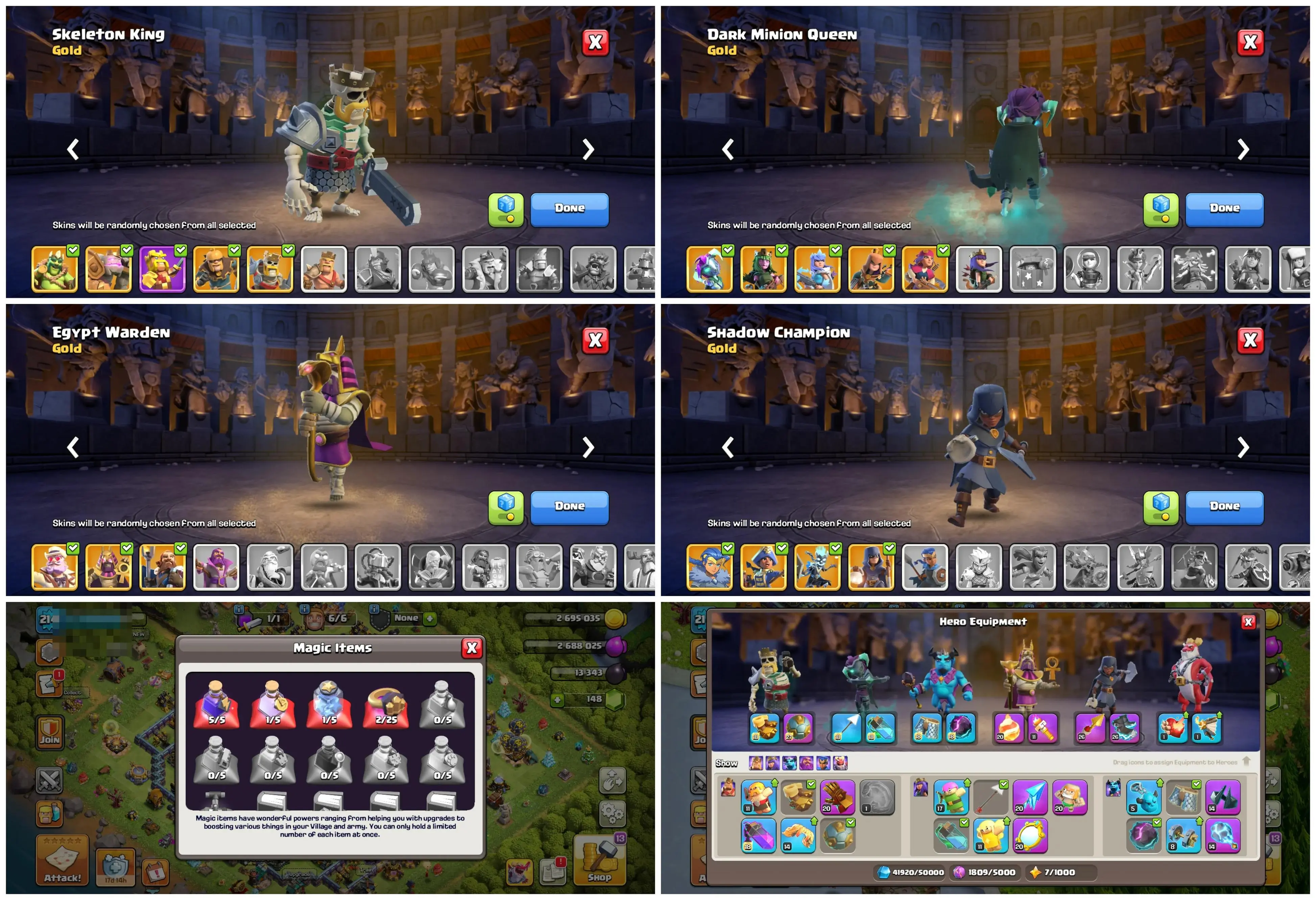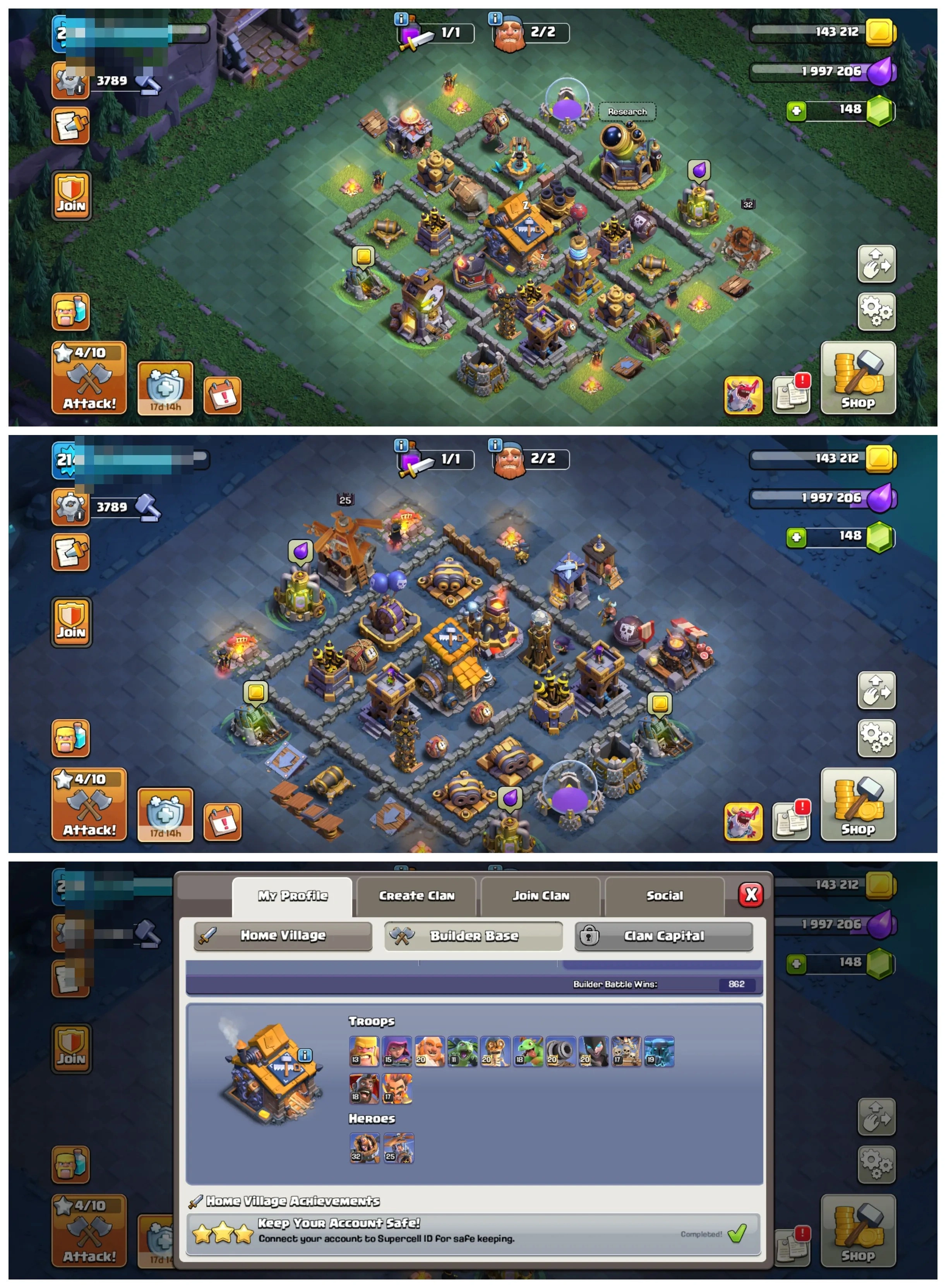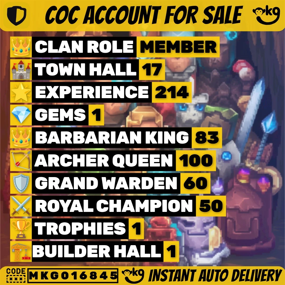 🏰 TH17 🛡️ Good Defence | 💎 — | 📈 Lvl 214 | 🦸♂️ Heroes 83/100/59/60/50 | 👕 17 Skins | ⚔️ 11 Epic Eq. | 💰 Nc 500 Gems | 📱 Android/iOS | 🆔 M3761 !MKG016845