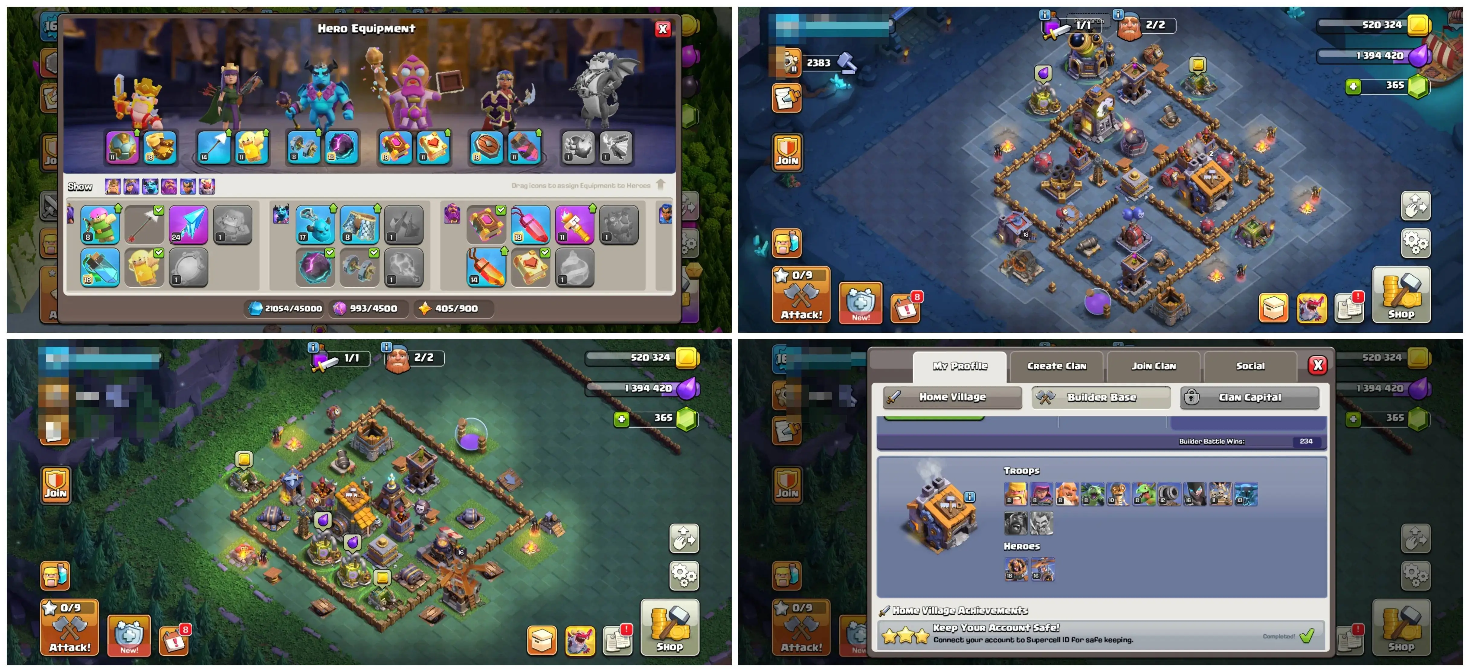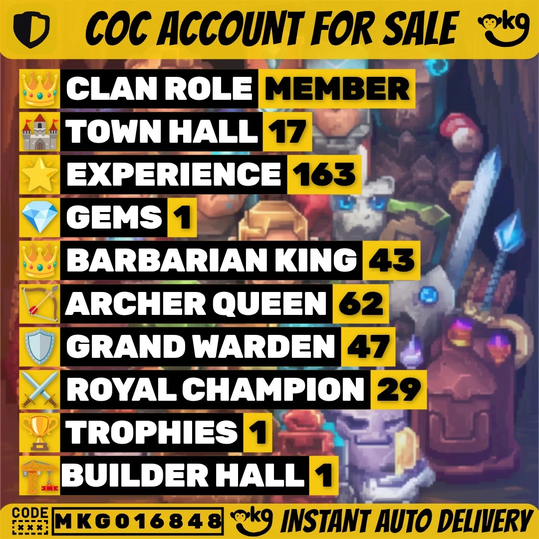 🏰 TH17 🛡️ Good Defence | 💎 — | 📈 Lvl 163 | 🦸♂️ Heroes 43/62/46/47/29 | 👕 3 Skins | ⚔️ 3 Epic Eq. | 💰 Nc 1,000 | 📱 Android/iOS | 🆔 M3764 !MKG016848