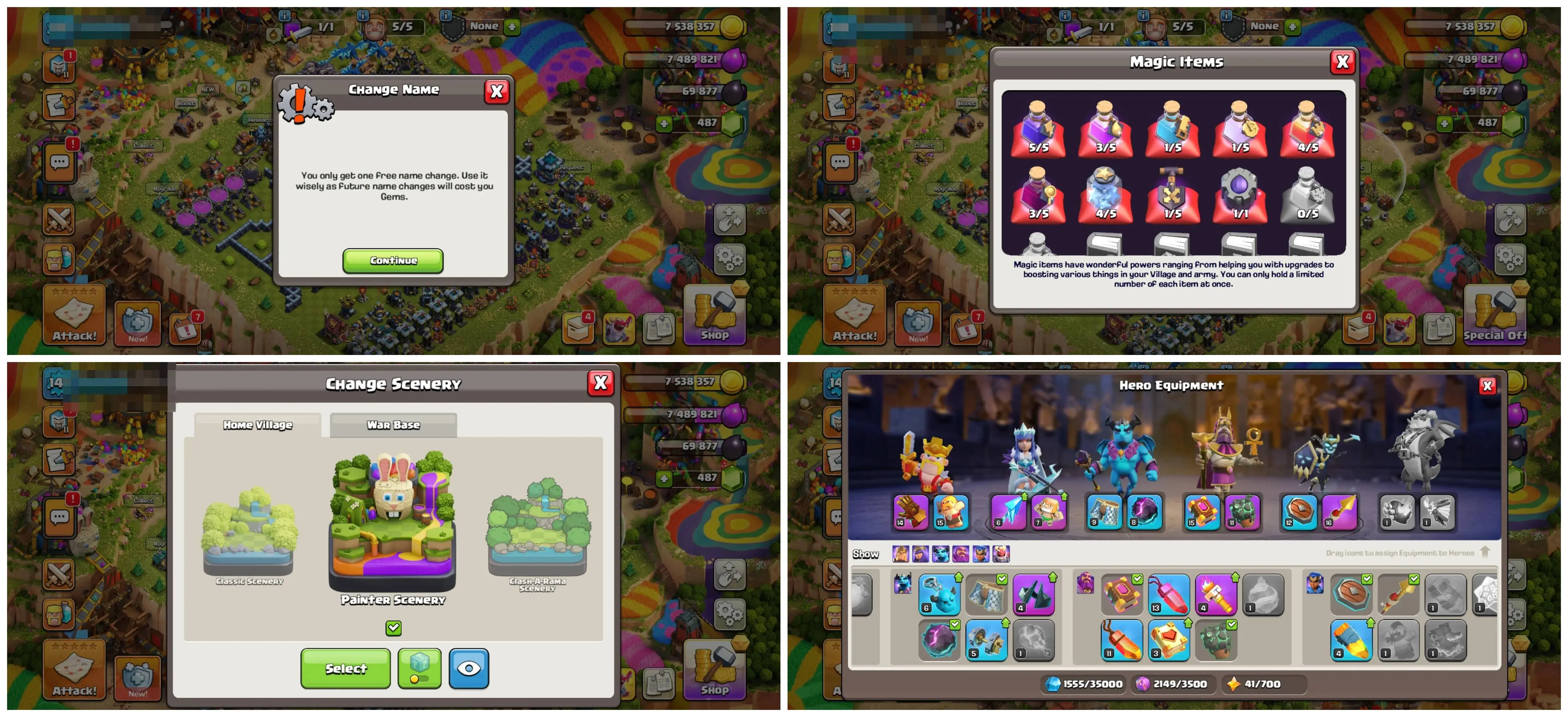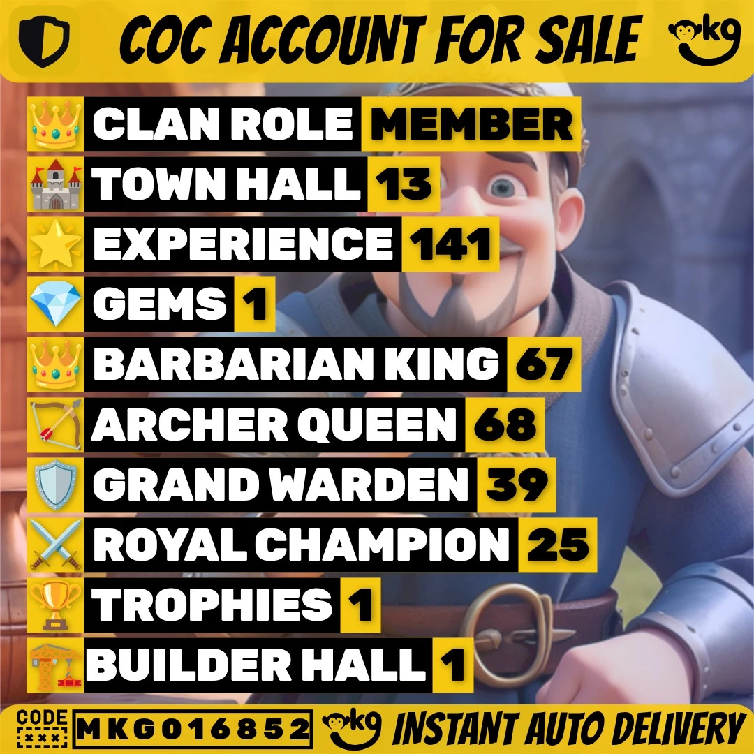 🏰 TH13 🔥 Near Max | 💎 — | 📈 Lvl 141 | 🦸♂️ Heroes 67/68/31/39/25 | 👕 6 Skins | ⚔️ 7 Epic Eq. | 🎨 1 Scenery | 💰 Nc Free | 📱 Android/iOS | 🆔 M3768 !MKG016852