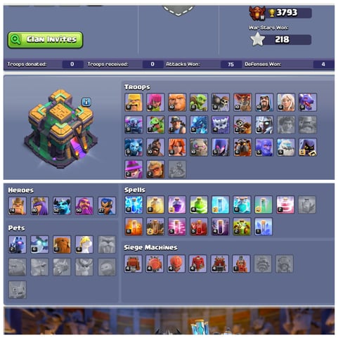 🏆 [QUEEN & WARDEN MAX] TH16🎖️ XP 219 ⚙️ 5 EPIC EQUIPMENTS /1 EPIC MAX 🛡️ MAX DEFANCE & ARMY🏰 OVERPOWER BASE 💎 234 GEMS📝
