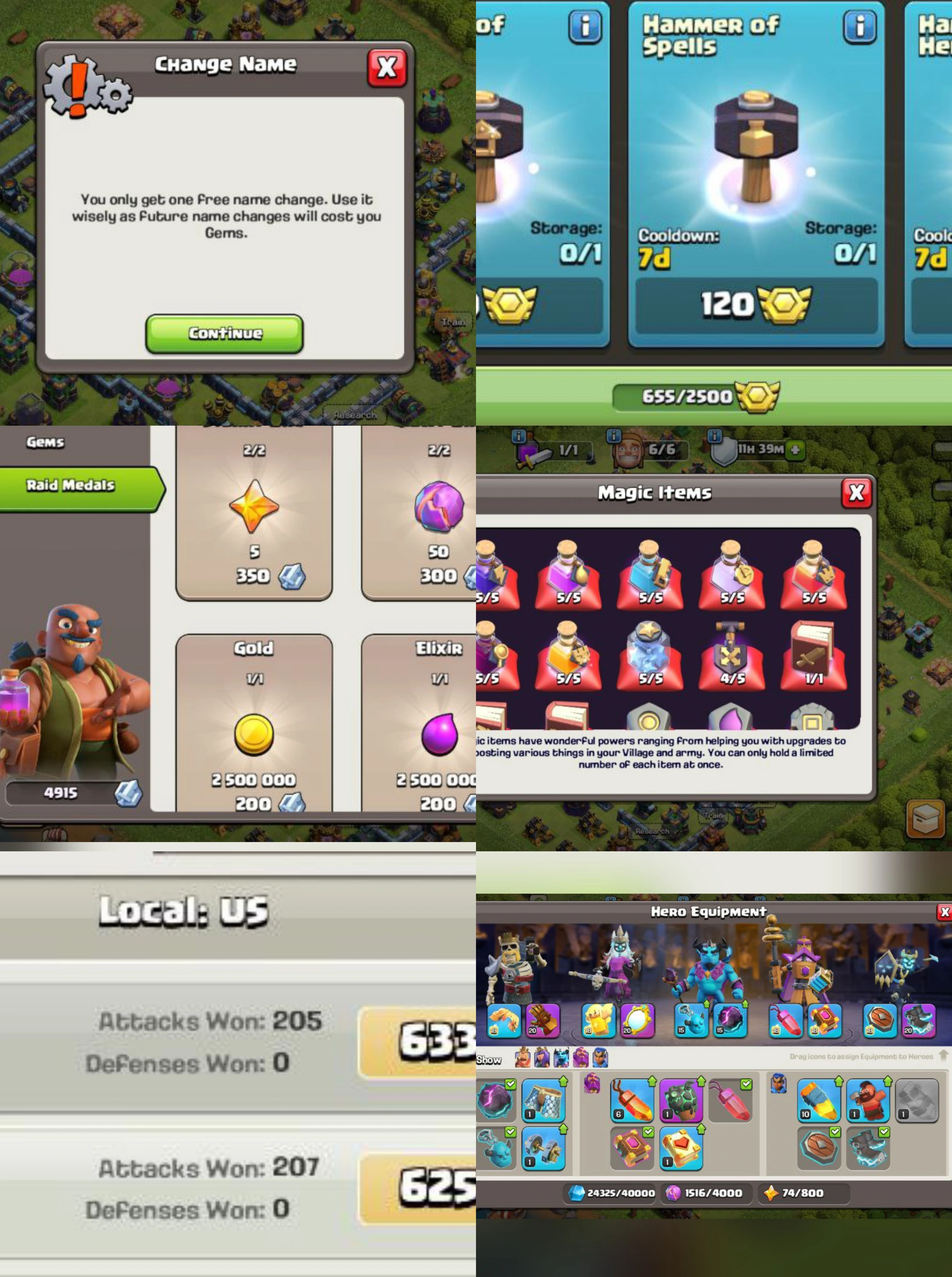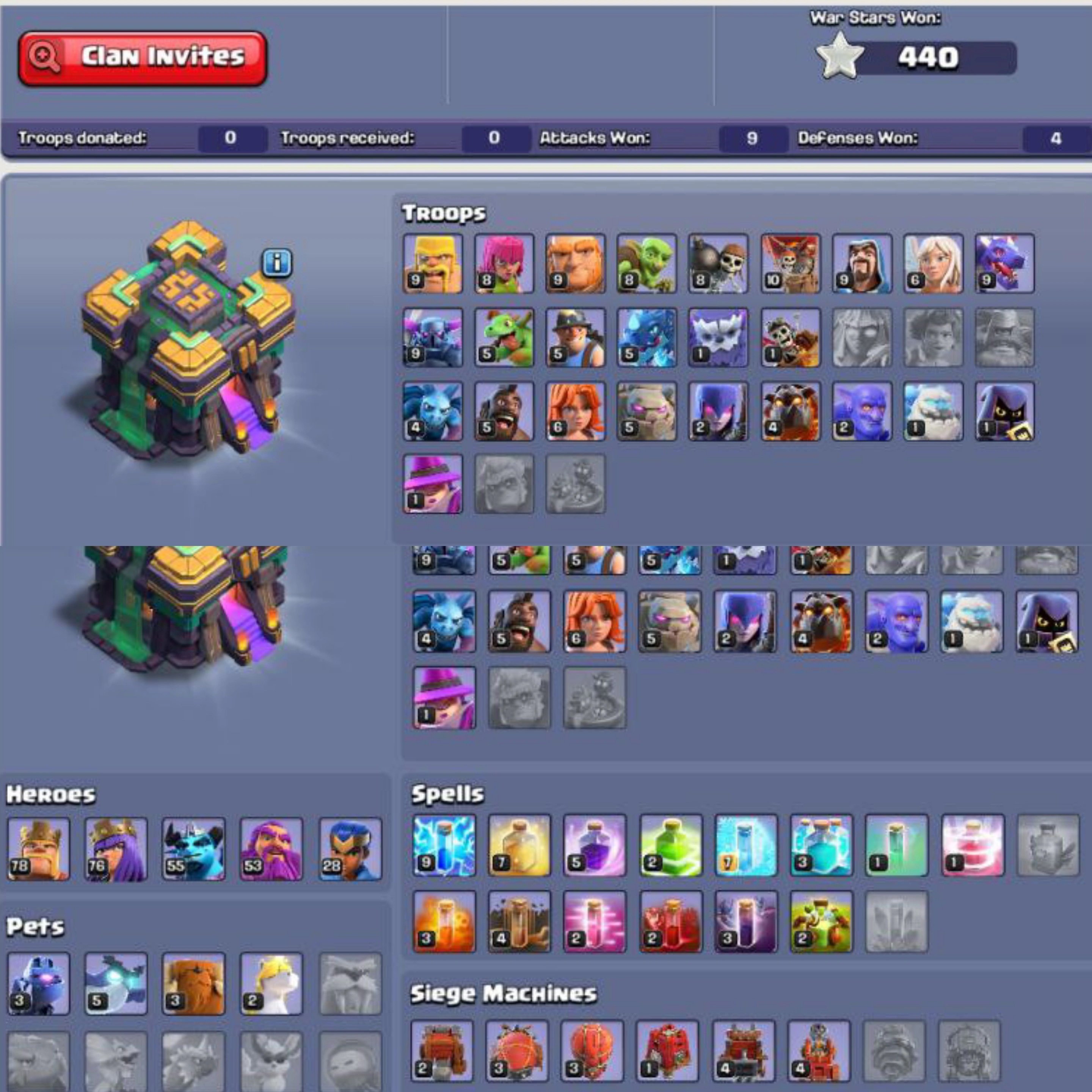 [US LOCAL]-[4 EPIC EQUIPMENTS]-[GHOST CHAMPION SKIN] TH14 SEMI | HERO:78-76-53-28 | XP:164 | 600+CWL MEDALS | FREE NAME CHANGE | MAGIC ITEMS