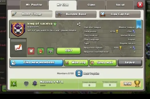 Clan lvl-25 ⭕ Name: king of sachiva ⭕CP 10 full max⭕master league 1⭕postive War log⭕600 war won⭕ english name ⭕ cheap price ⭕