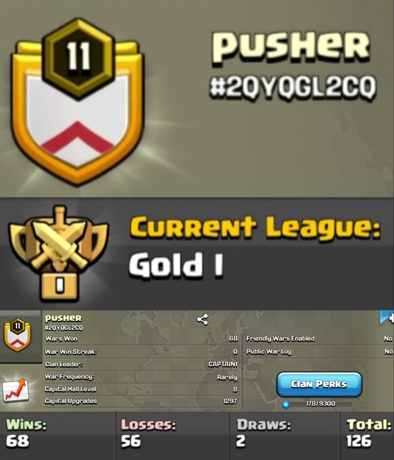 Level 11 clan || clan capital 8 || gold 1 || warlog 68-56 || single word name - pusher