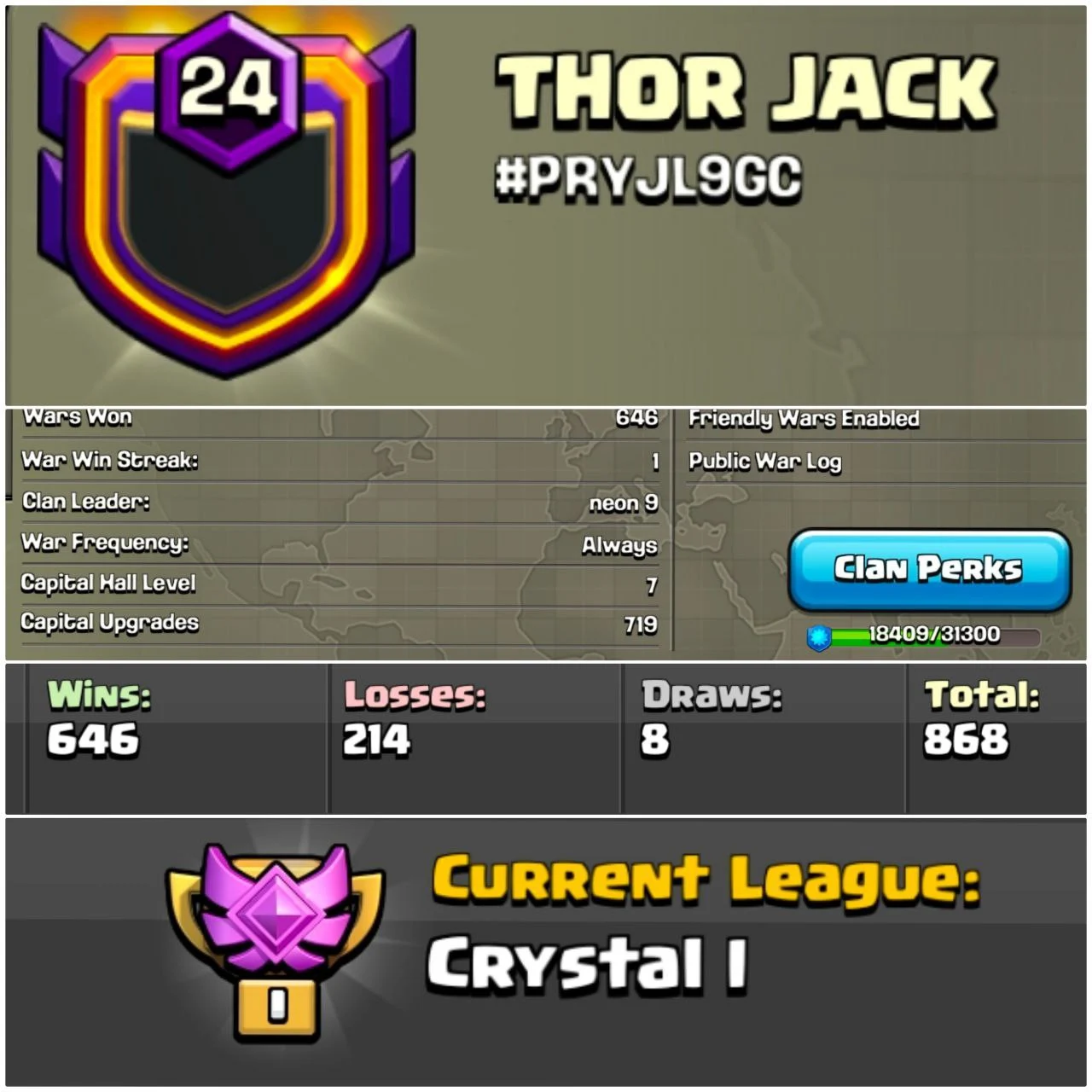 Level 24 | Name- THOR JACK | Clan Capital 7 | Awesome Warlog | Crystal League | Fast Delivery!
