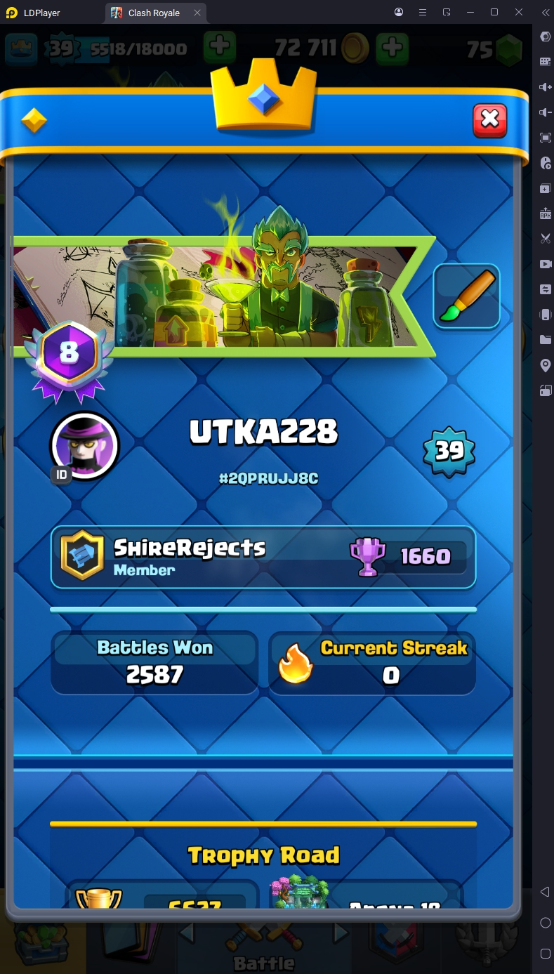 6627 TROPHY 🏆 39 LVL 💯 KT 13 👑 110 CARDS ♦️ EMOTE 31 🎭 #2QPRUJJ8C ⸱ TAG ACCOUNT ♥️