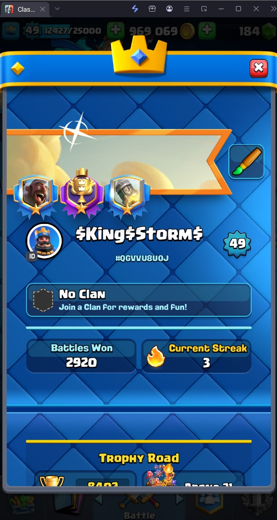 8402 TROPHY 🏆 49 LVL 💯 KT 14 👑 120 CARDS ♦️ 6 MAX CARDS 👑 2 ELITE CARDS 🔮 8 EVO 💯 EMOTE 55 🎭 #QGVVU8U0J ⸱ TAG ACCOUNT ♥️