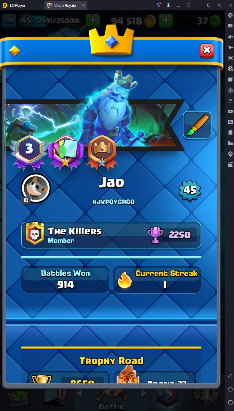 8650 TROPHY 🏆 45 LVL 💯 KT 14 👑 116 CARDS ♦️ 4 MAX CARDS 👑 3 ELITE CARDS 🔮 6 EVO 💯 EMOTE 30 🎭 #JVPQYCRG0 ⸱ TAG ACCOUNT ♥️
