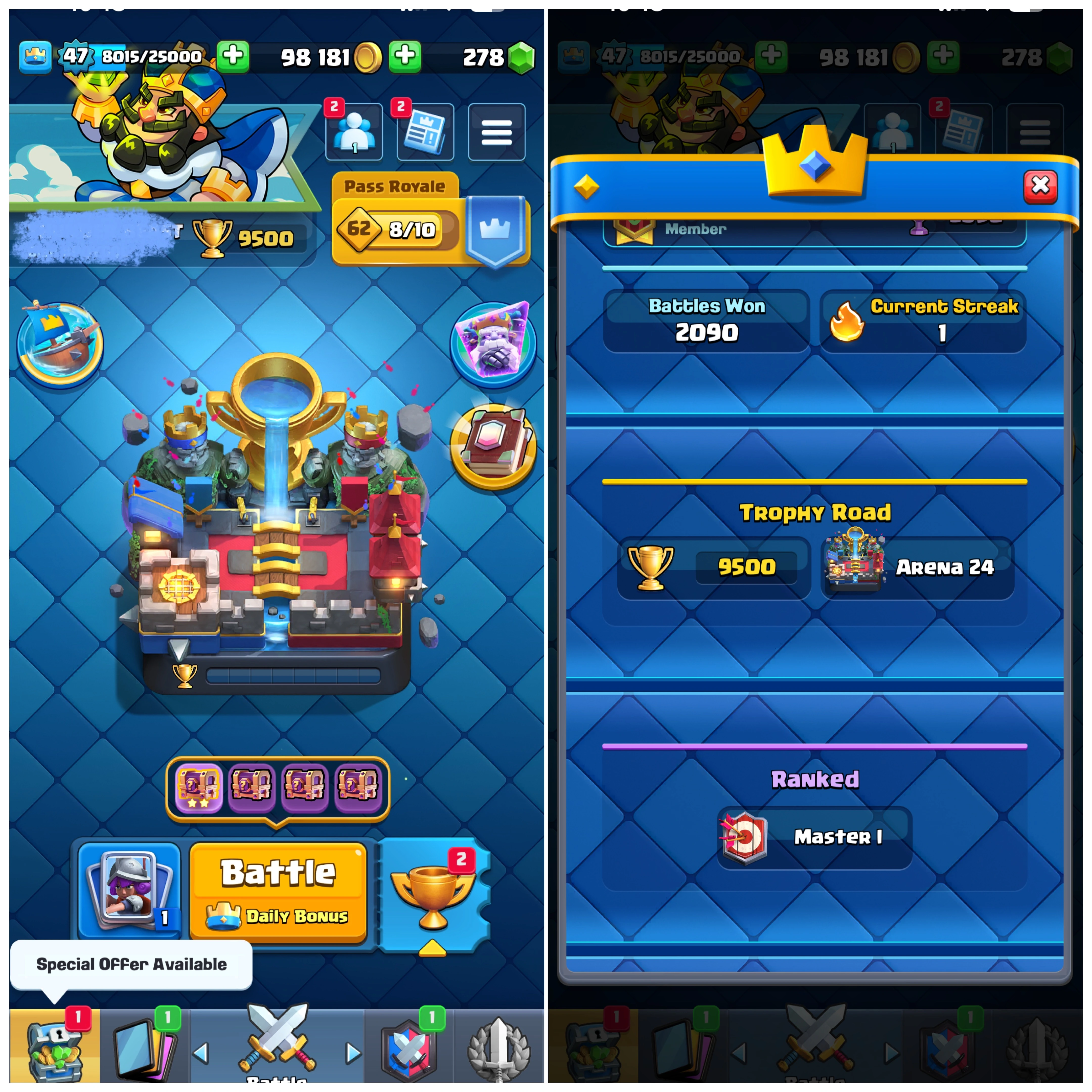 🔥 Cheap & Maxed Out  🌟 9500 Trophies 🏆| Level 47 🔥 | King Tower 14 👑 | Arena 24 ⚔️ | Emote 35 😎 Cards 120 🚀 Instant Delivery 🚀  Lifetime Access ✅ | #P752