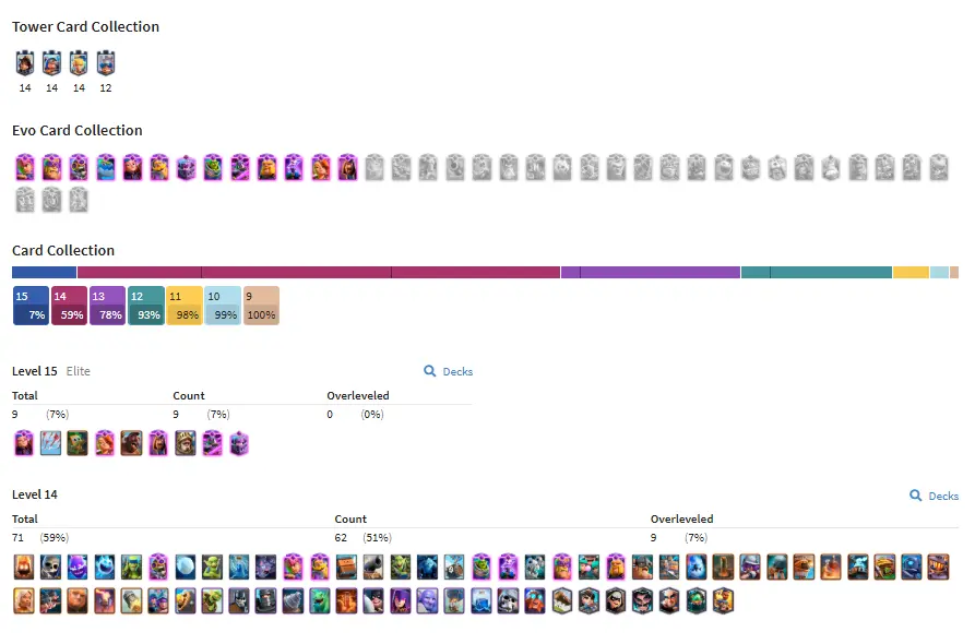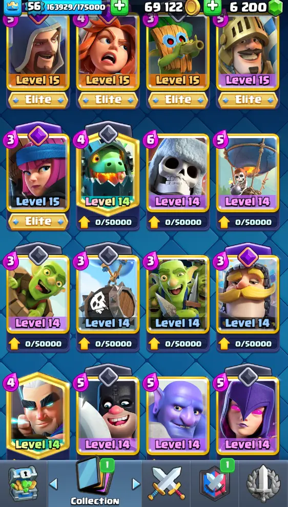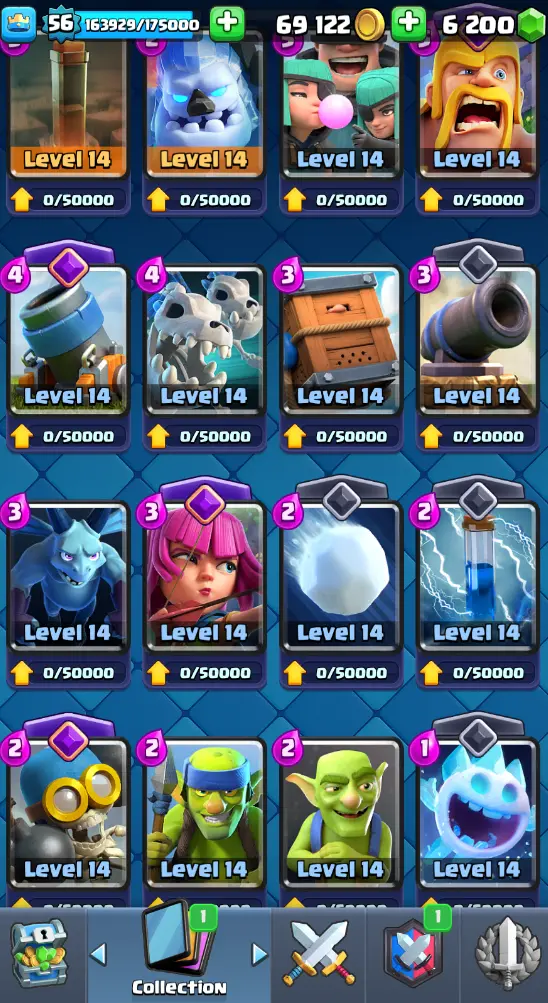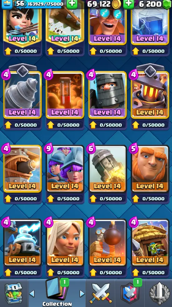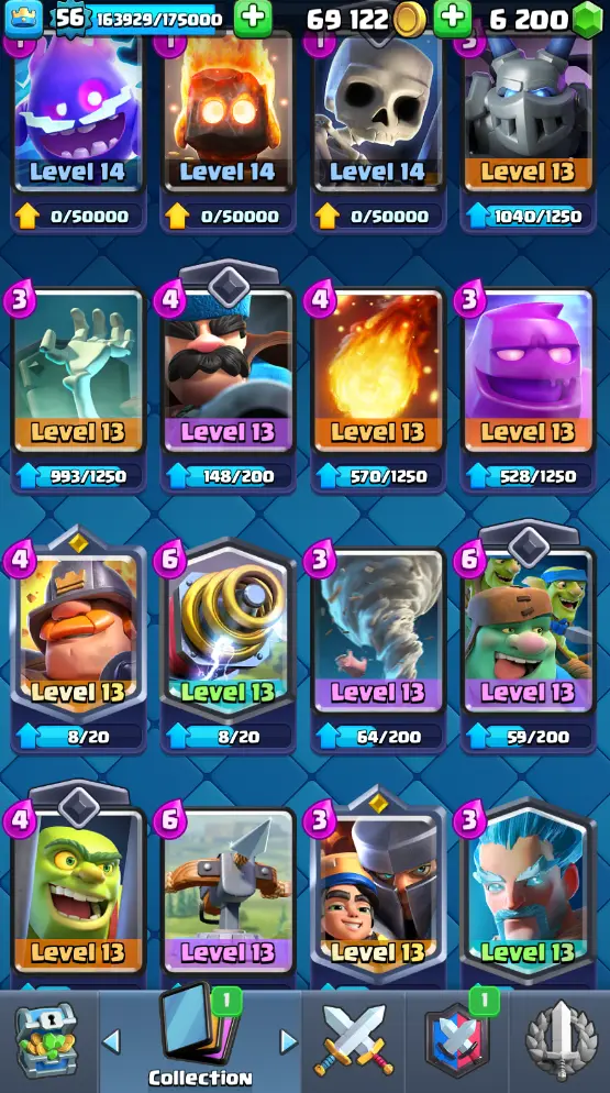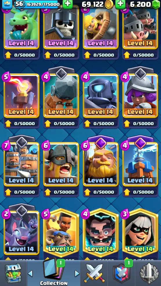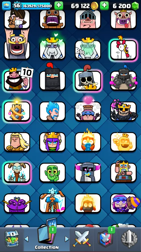 CR Lvl 56 almost 57 ✨ 9400 Trophy ✨ KT 15 ✨ 9 Elite cards ✨ 71 max cards ✨ 13 Evo cards ✨ Stacked inventory ✨ 6200 Gems ✨ 65 emotes ✨ 14 Tower skins