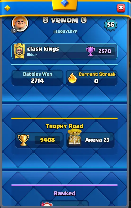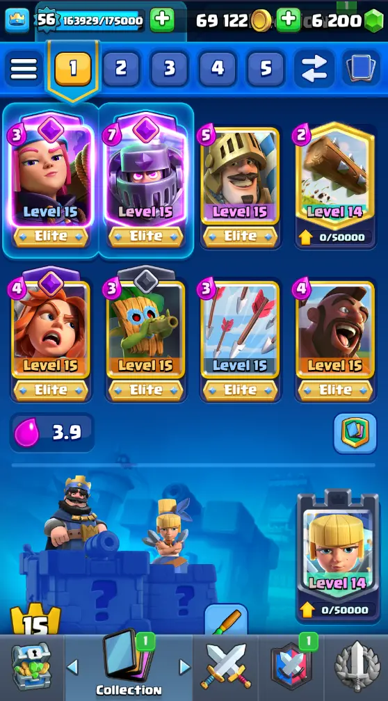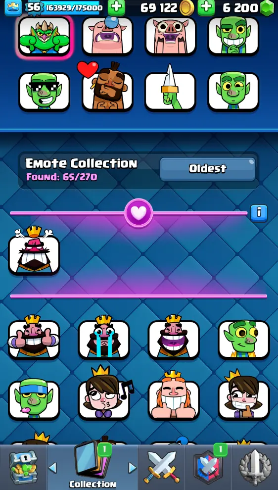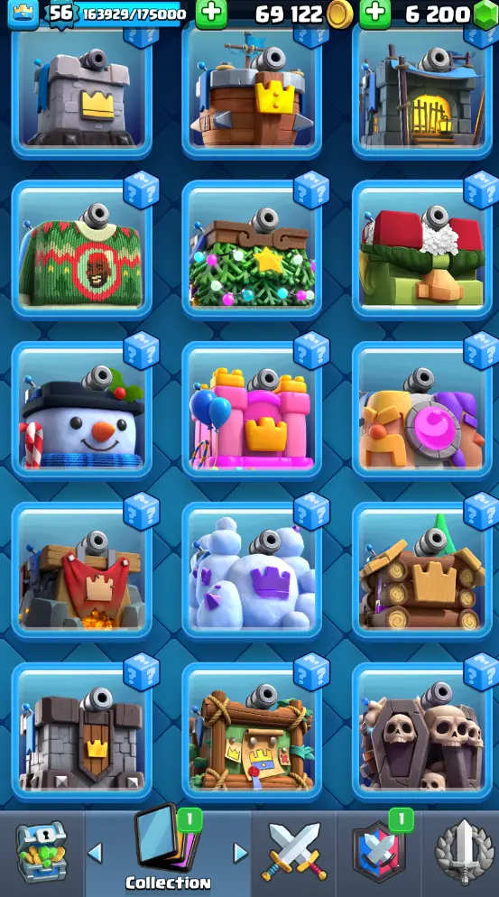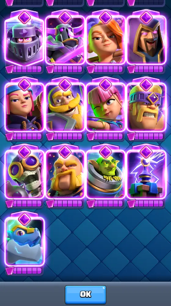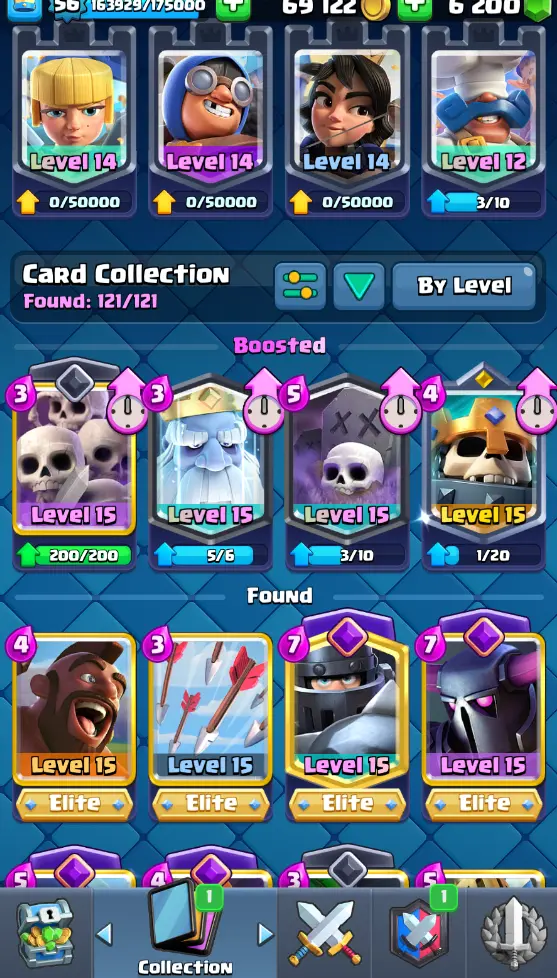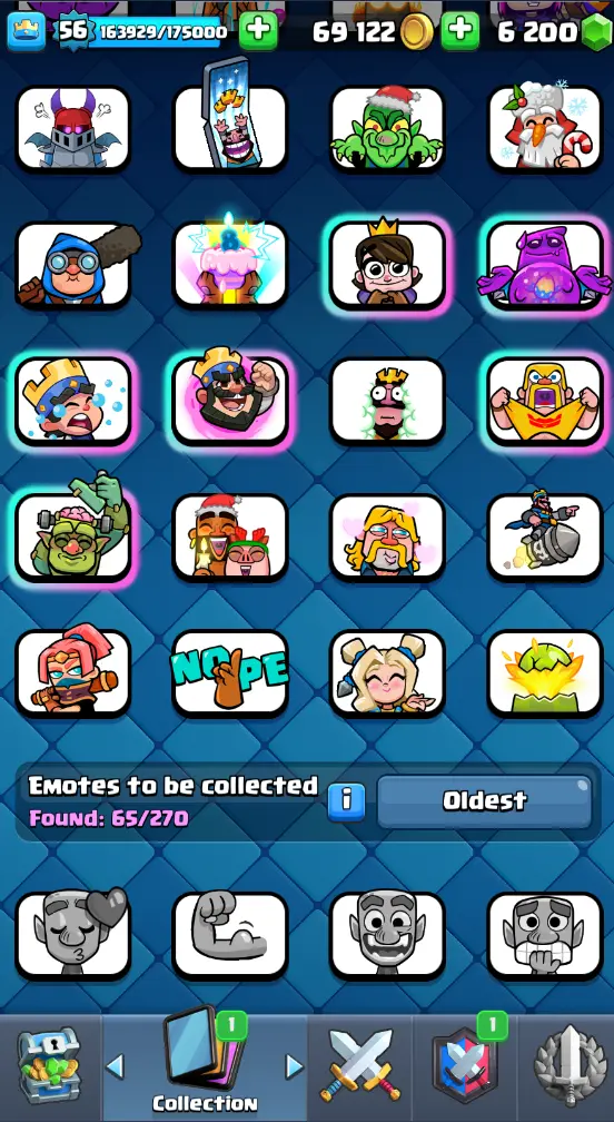 CR Lvl 56 almost 57 ✨ 9400 Trophy ✨ KT 15 ✨ 9 Elite cards ✨ 71 max cards ✨ 13 Evo cards ✨ Stacked inventory ✨ 6200 Gems ✨ 65 emotes ✨ 14 Tower skins