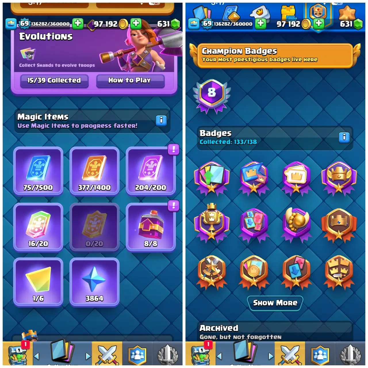 🏆CR LVL 69 🔥|| KT LVL 15 🔥|| 15 EVOLUTION🔥 || 41 ELITES🔥 || 83 CARD MAX🔥 ||160 EMOT 🔥|| 8 YEAR OLD ACCOUNT🔥 || LOADED MAJIC ITEM 🔥|| 138/133 BADGES AVAILABLE 🏅|| CHEAP DEAL ✅