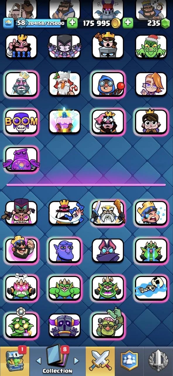 #CRL 1 EMOTE ✨ KT 15 🔱 LVL 58 🏆 CUPS[8745] ✨ MAX CARDS [55] ✨ ELITE [16] ✨ EVO [6] ✨ LVL 14 [39] ✨ EMOTES [160] ✨ SKINS [6] 🔱 CARDS [117] ✨FREE SQUAD BUSTER ✨ 10000% SAFE