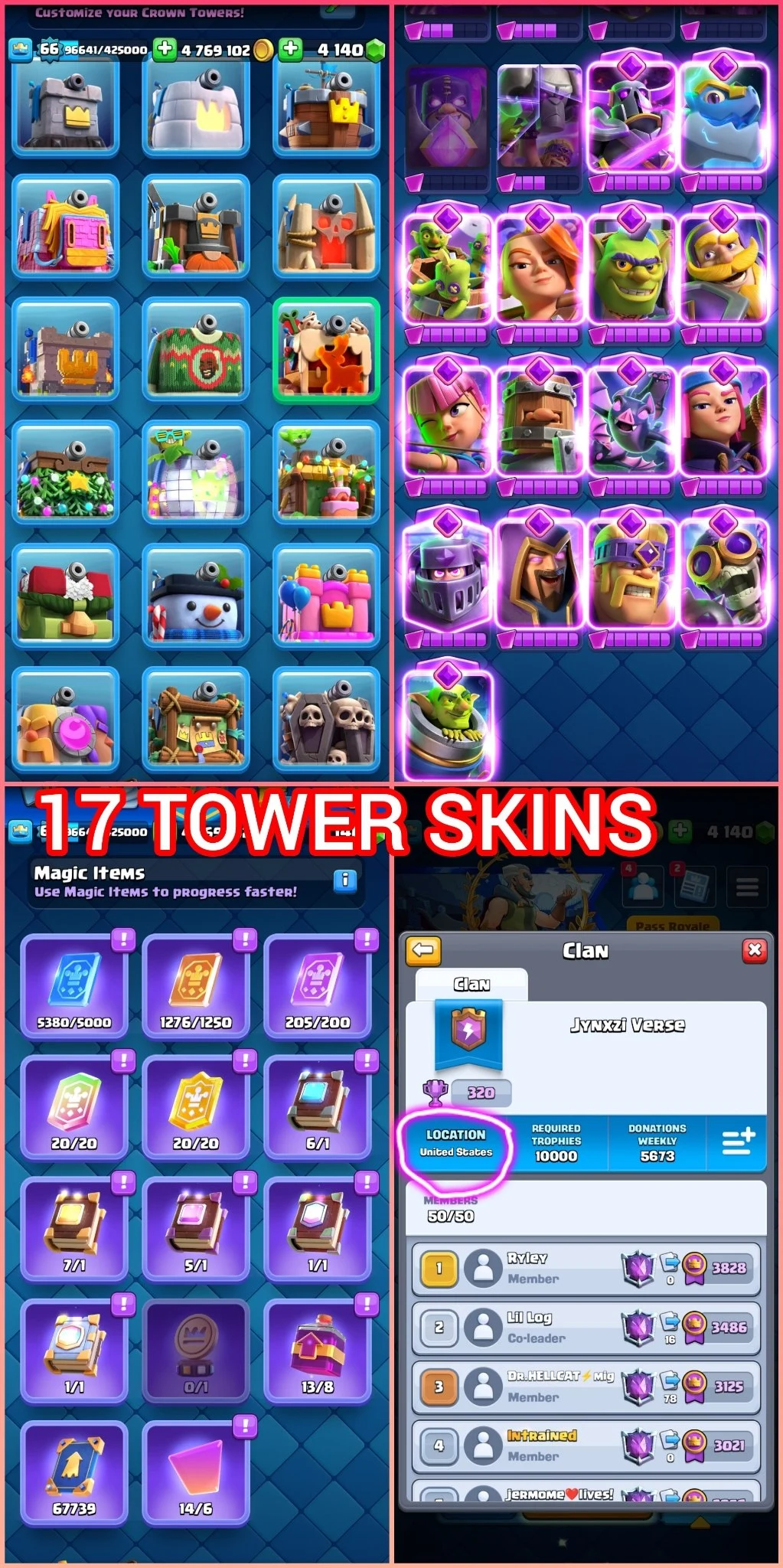 🎉 HURRY! 50% OFF – MEGA SALE 🎉 3 TOP RANK 🏆 US LOCAL 🇺🇸 12000 TROPHIES 🏆 ARENA 24 SA-3 🏟️ 120 MAX🎴63 ELITES ⚡ 17 EVOS 💯 XP66-KT15 👑 17 KT SKINS 💠 238 EMOTES 🎭 INSTANT 🚀