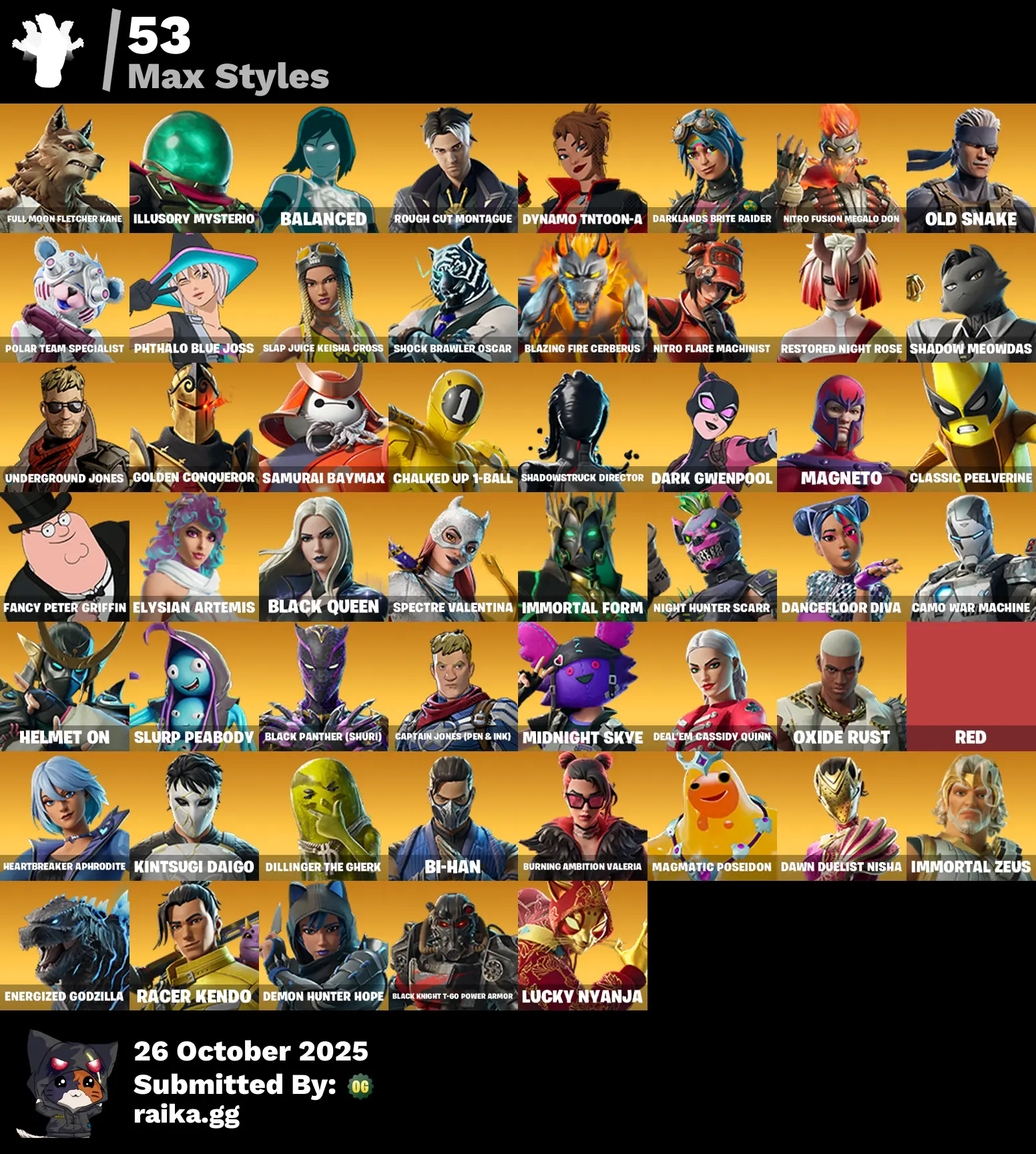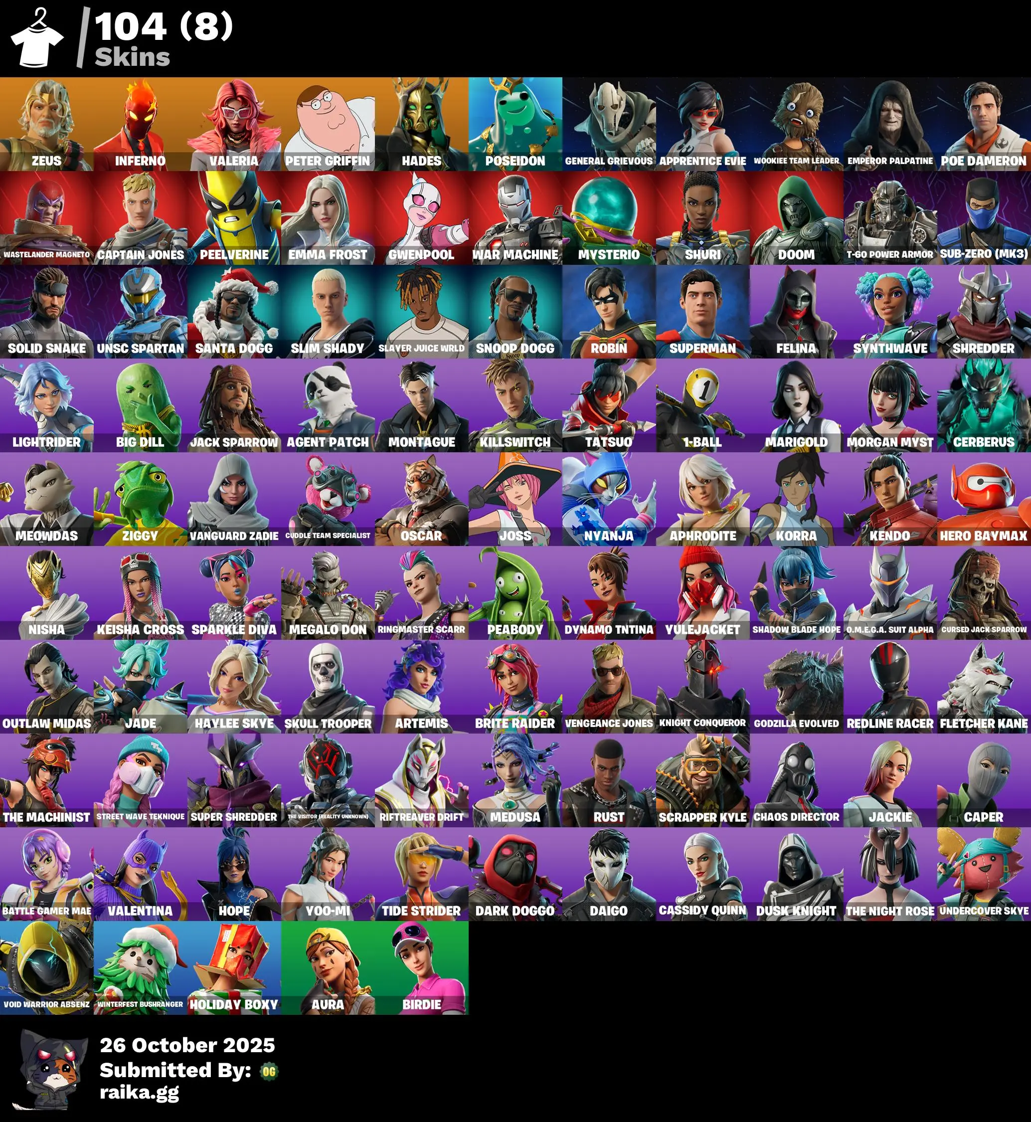 104 skins | Valeria🎃Peelverine🎃General Grievous🎃Zeus🎃Poseidon🎃Doom🎃Gwenpool🎃Hades🎃Emma Frost🎃Wookiee Team Leader🎃Wastelander Magneto🎃Mysterio🎃Emperor Palpatine🎃War Machine🎃Inferno🎃Apprentice Evie🎃Shuri🎃Poe Dameron🎃Peter Griffin D5225