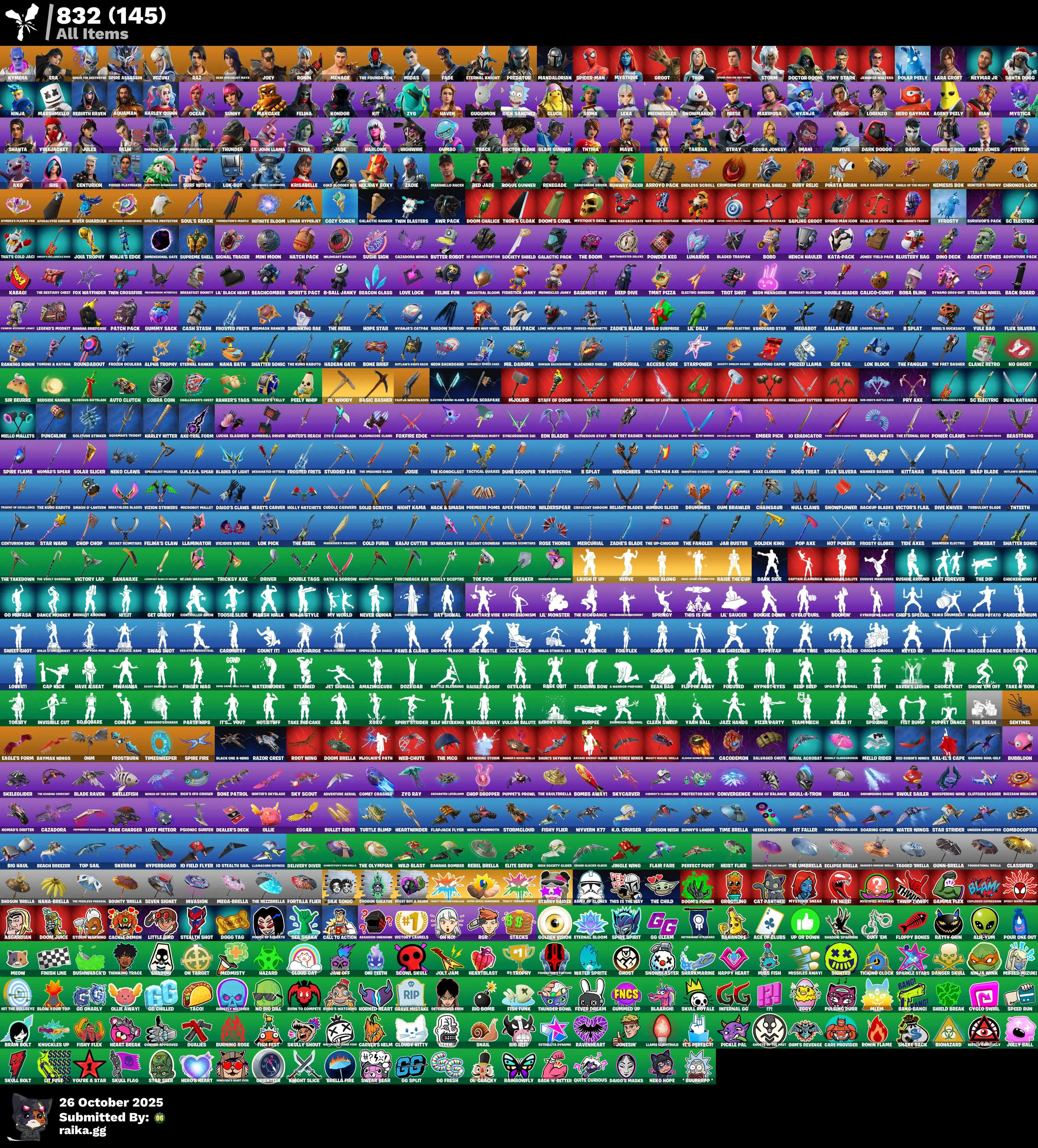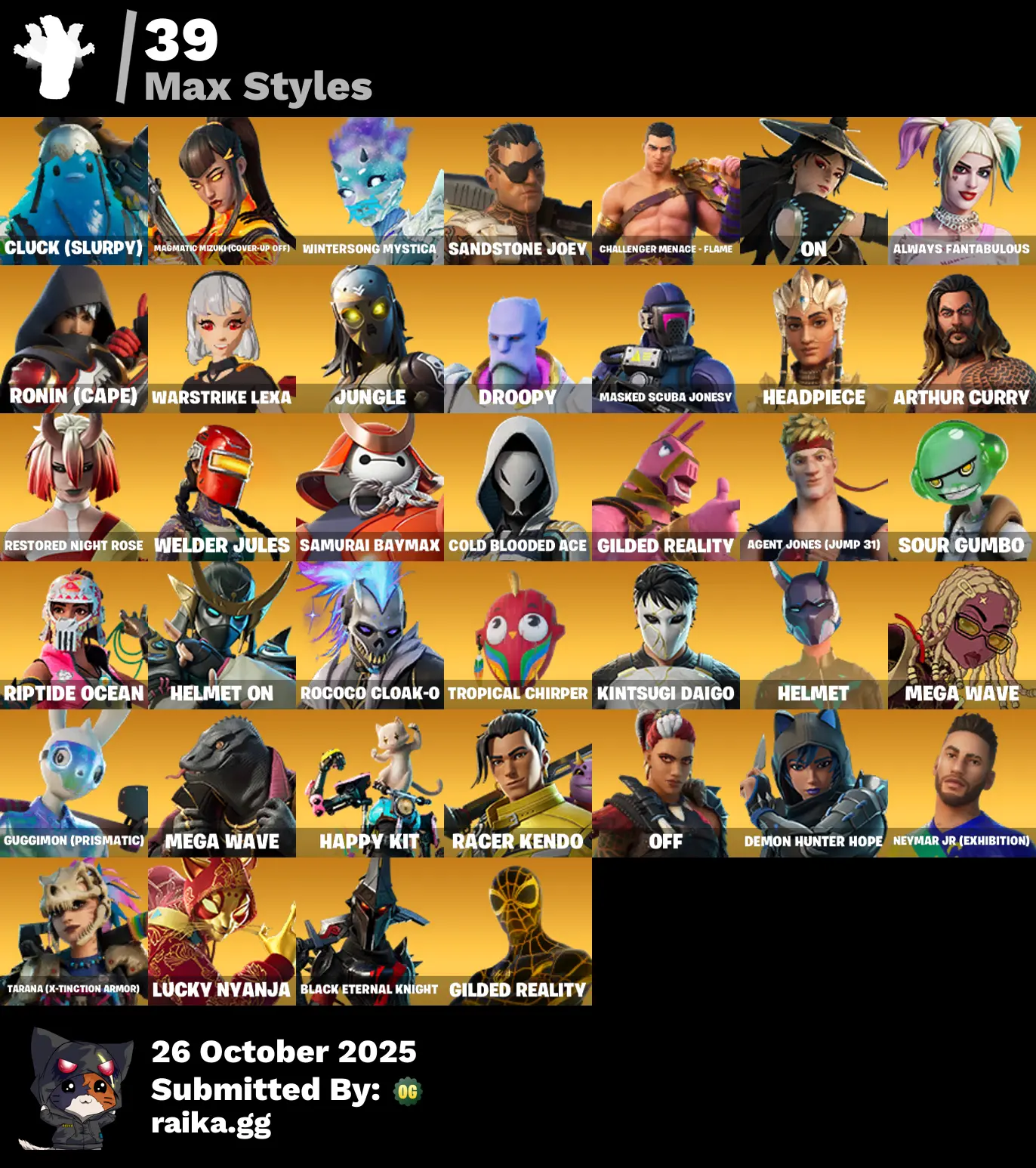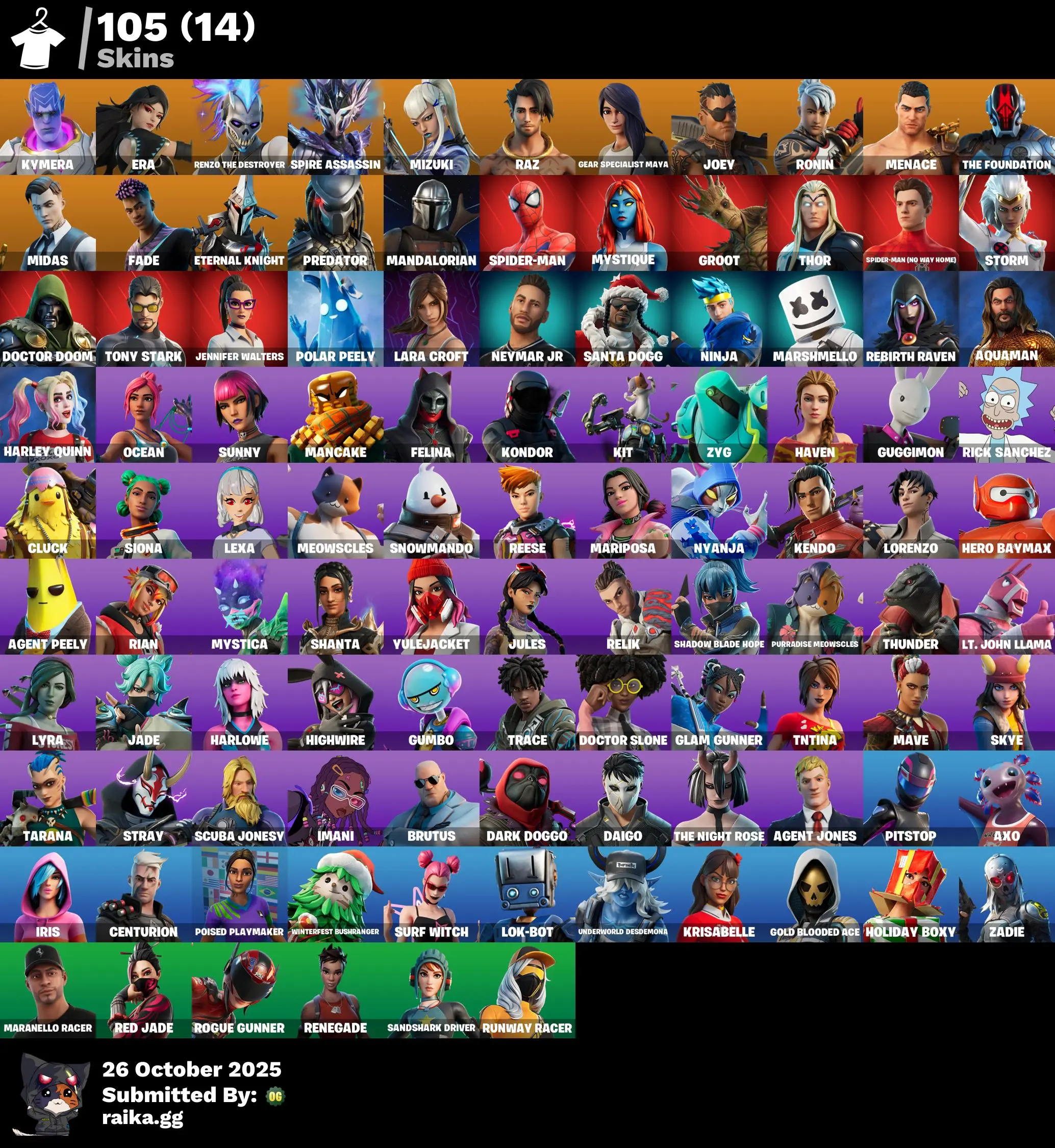 105 skins | Predator🎃Fade🎃Era🎃Thor🎃Ronin🎃Kymera🎃Doctor Doom🎃Joey🎃Gear Specialist Maya🎃Midas🎃Menace🎃Storm🎃Spider-Man🎃Renzo the Destroyer🎃Groot🎃Spire Assassin🎃The Foundation🎃Mandalorian🎃Spider-Man (No Way Home)🎃Raz🎃Mizuki🎃Mystique D5228