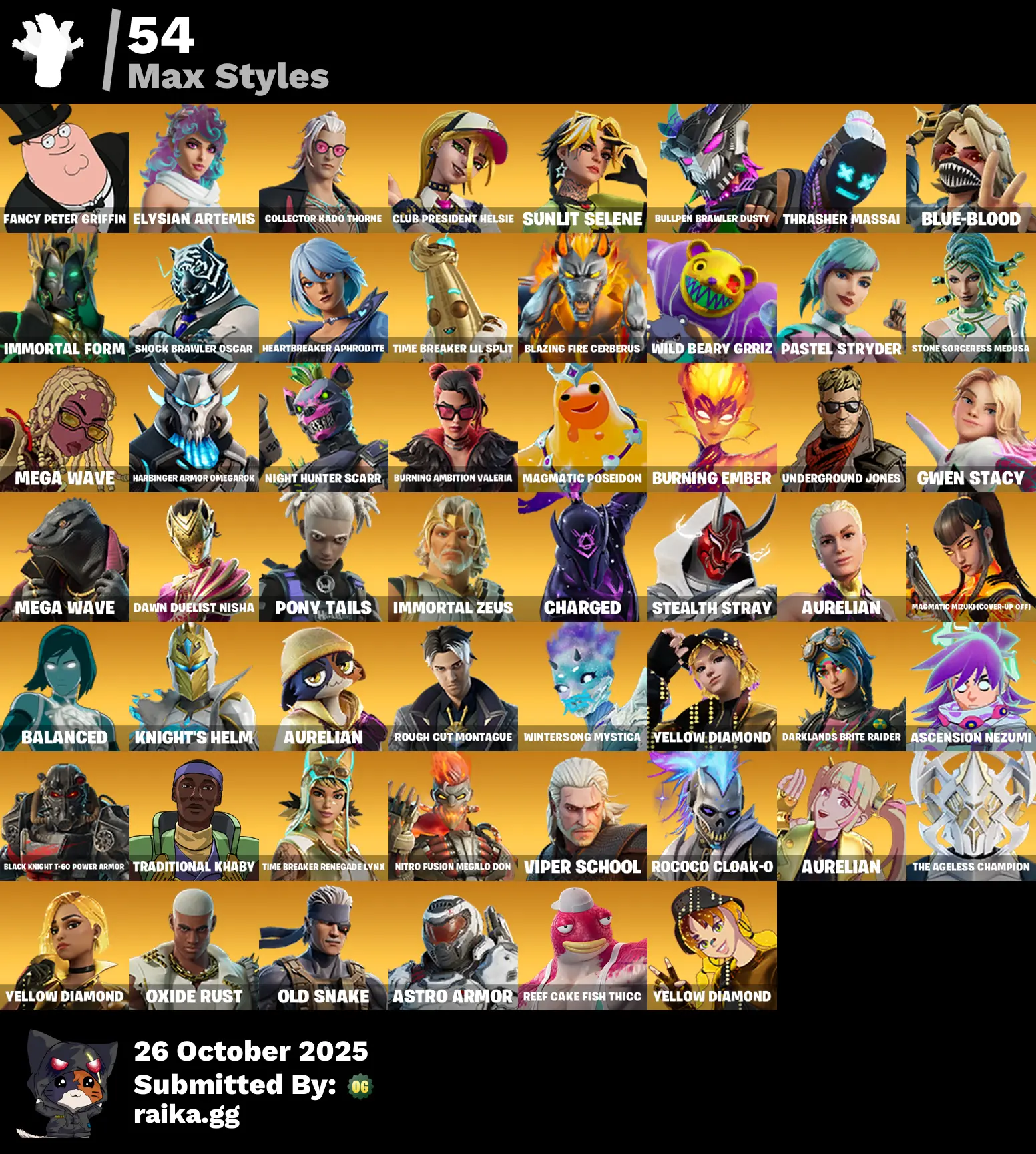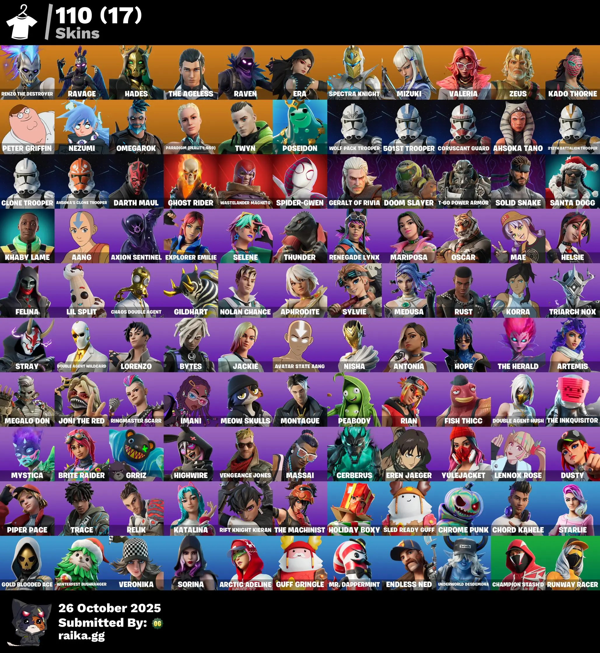 110 skins | Nezumi🎃Peter Griffin🎃Mizuki🎃Era🎃Raven🎃Renzo the Destroyer🎃Zeus🎃The Ageless🎃Twyn🎃Omegarok🎃Coruscant Guard🎃Ravage🎃501st Trooper🎃Ahsoka Tano🎃Kado Thorne🎃Valeria🎃Wolf Pack Trooper🎃Poseidon🎃Hades🎃Paradigm (Reality-659) D5231