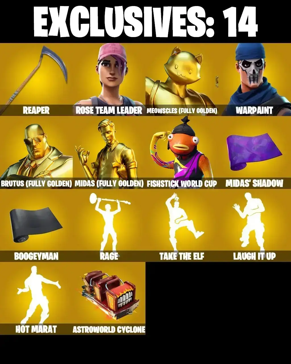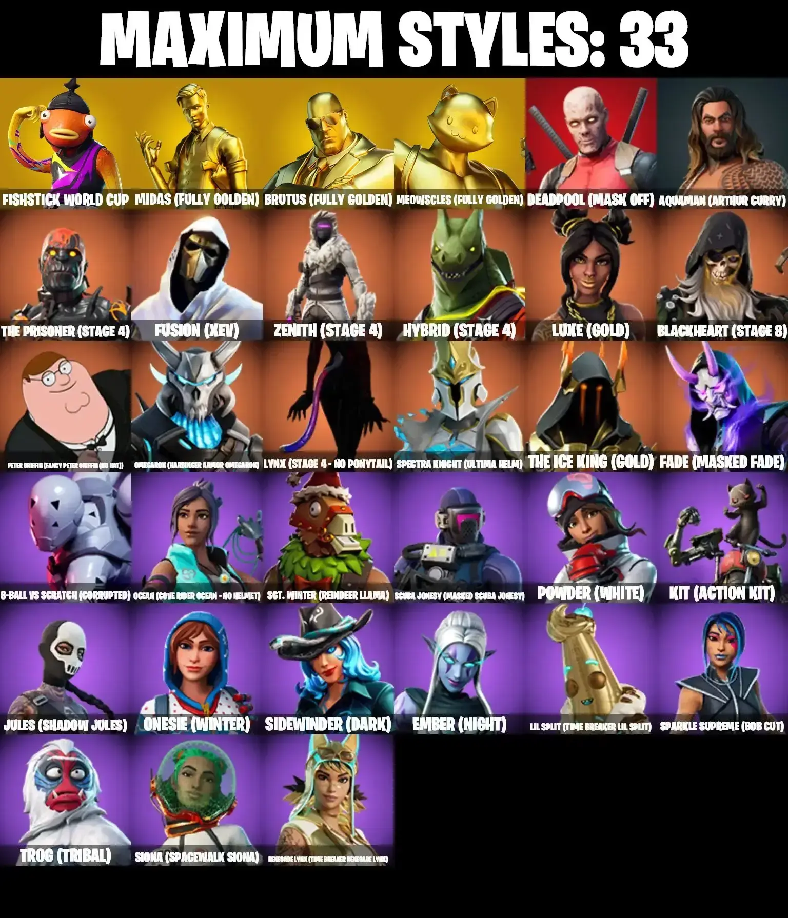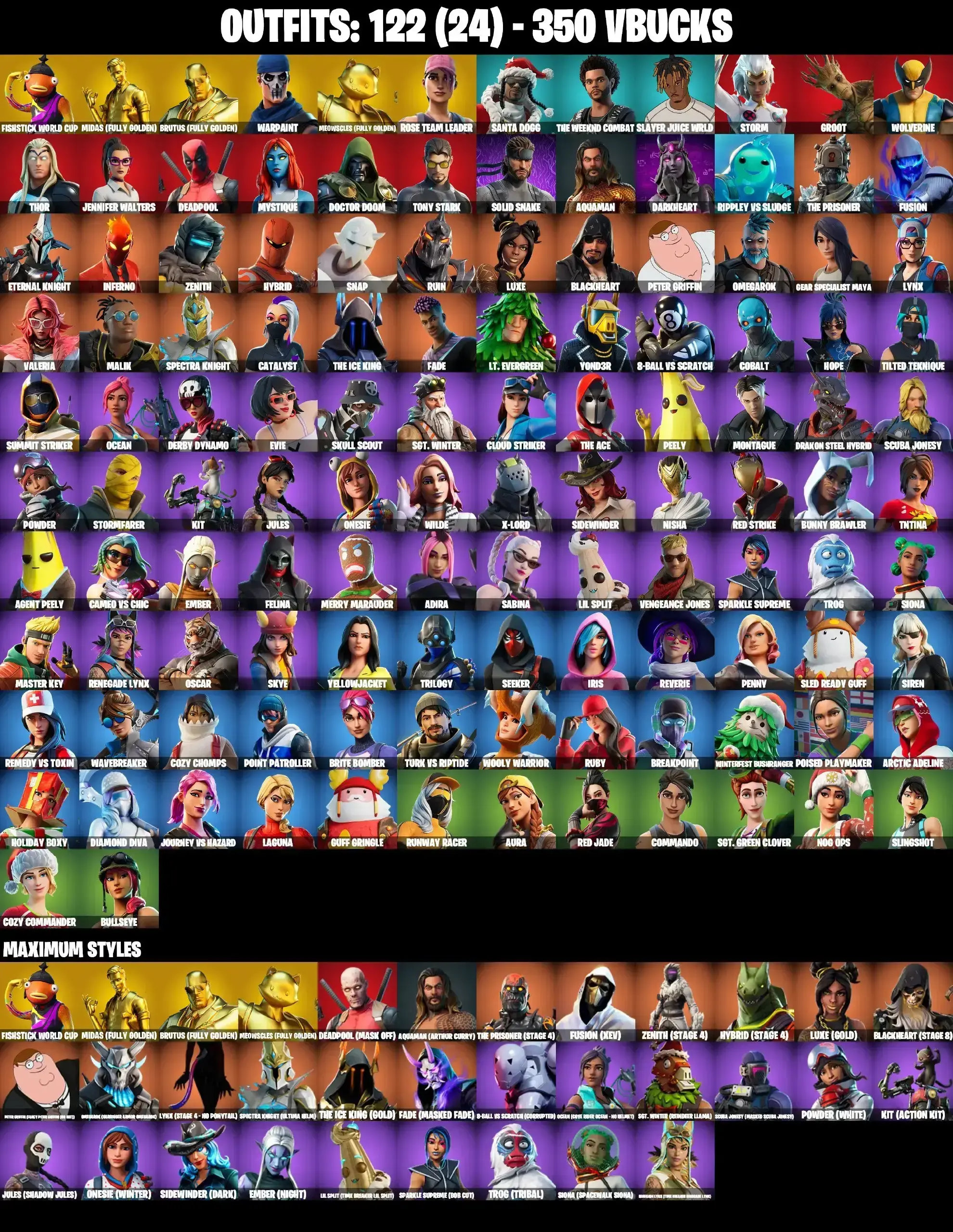 122 SKINS | OG STW FOUNDERS | FISHSTICK WORLD CUP | JABBA SWITCHWAY | DYNAMO DANCER | GOLDEN MIDAS | LAUGH IT UP | STAR WAND | ONESIE MAX | MAYA | EVIE | SKULL SCOUT | DRAKON STEEL HYBRID | REVERIE | AURA | BULLSEYE | AGENT PEELY