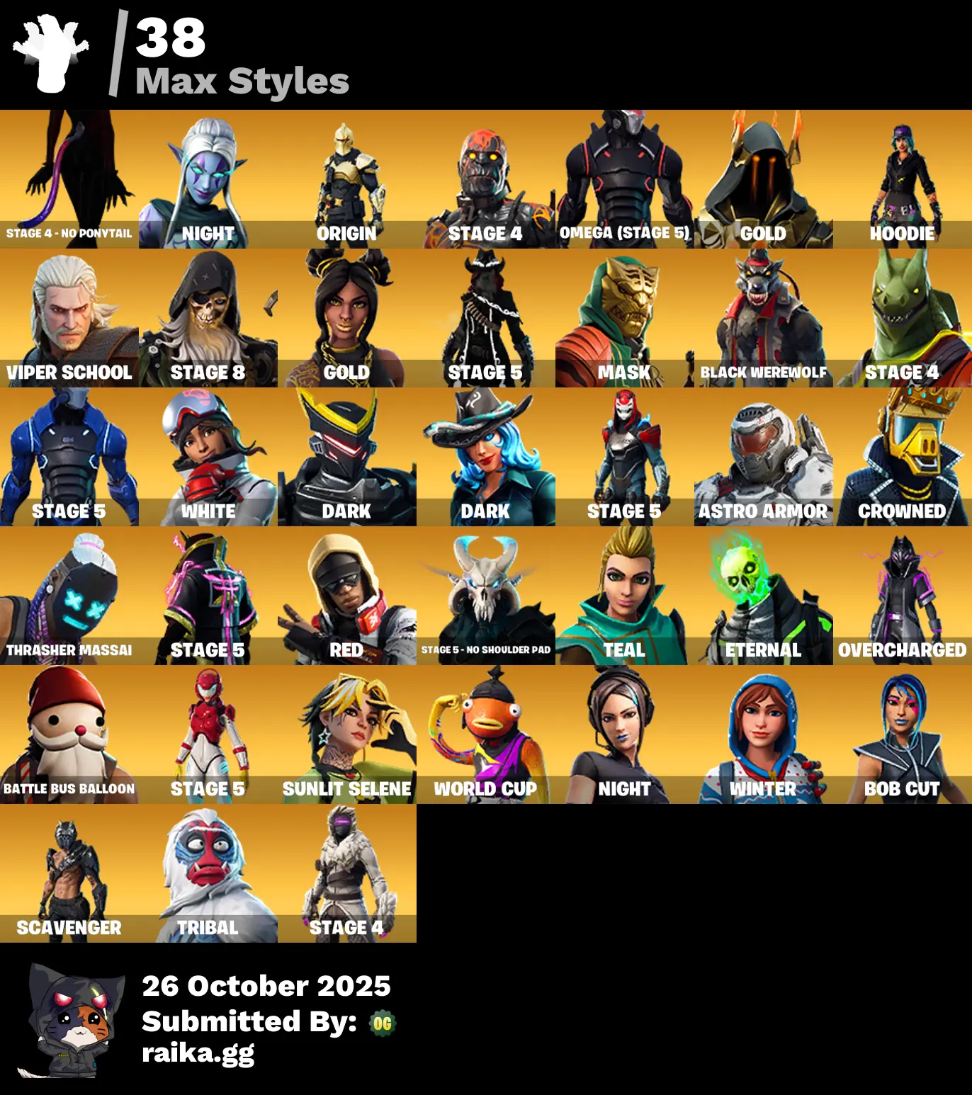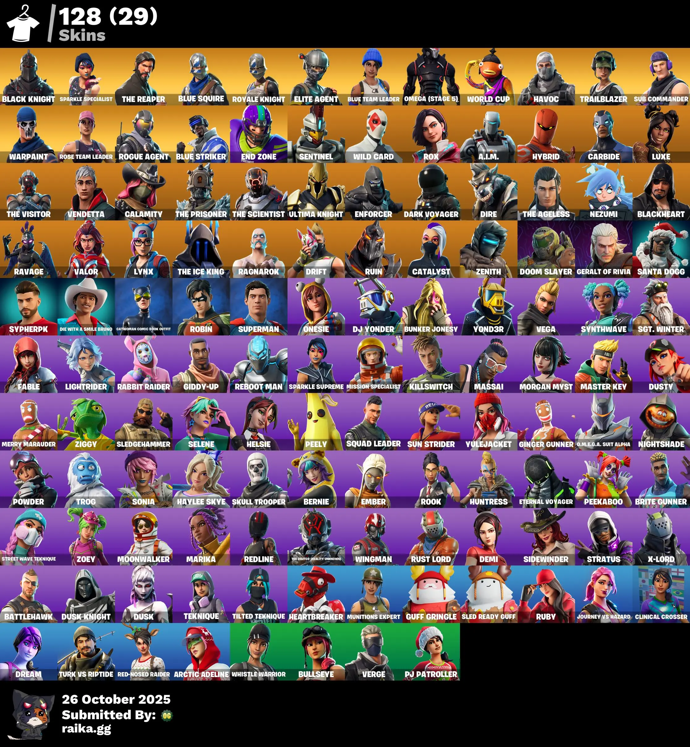 128 skins | Black Knight🎃Sparkle Specialist🎃The Reaper🎃Wild Card🎃Trailblazer🎃Royale Knight🎃Rogue Agent🎃Rox🎃OG STW🎃Elite Agent🎃End Zone🎃Hybrid🎃WORLD CUP🎃Blue Squire🎃Omega (stage 5)🎃Blue Team Leader🎃Sub Commander🎃Sentinel🎃A.I.M. D5229