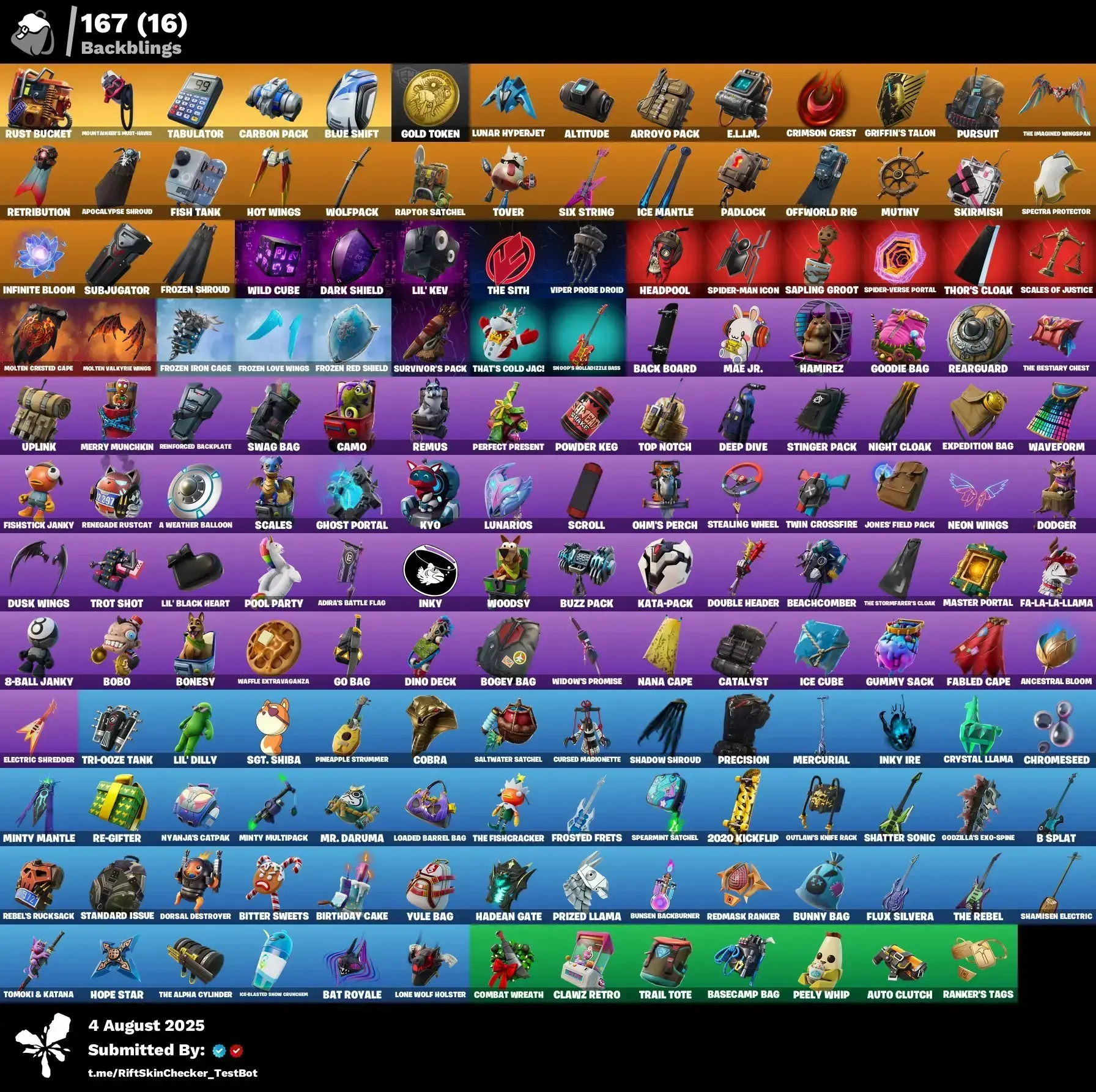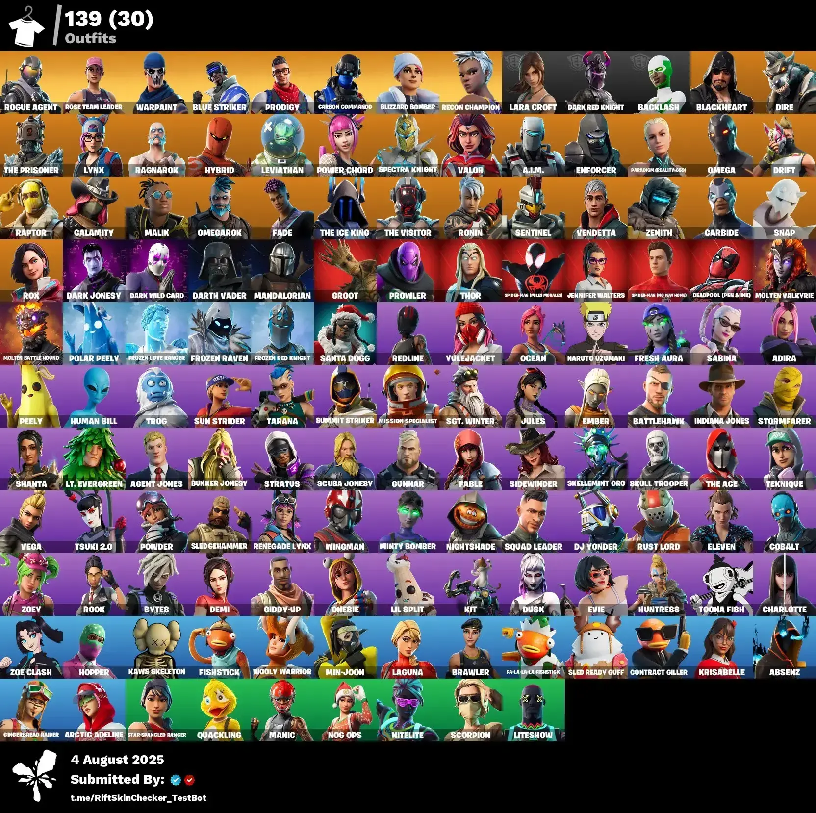 139 SKINS | TAKE THE L | OG STW FOUNDERS | BACKLASH | SKULL TROOPER | OMEGA | SPIDER-MAN MILES MORALES | SPIDER-MAN NO WAY HOME | MANDALORIAN | DARTH VADER | NARUTO | ORANGE JUSTICE | HUMAN BILL | KAWS SKELETON | TSUKI 2.0 | ZOEY