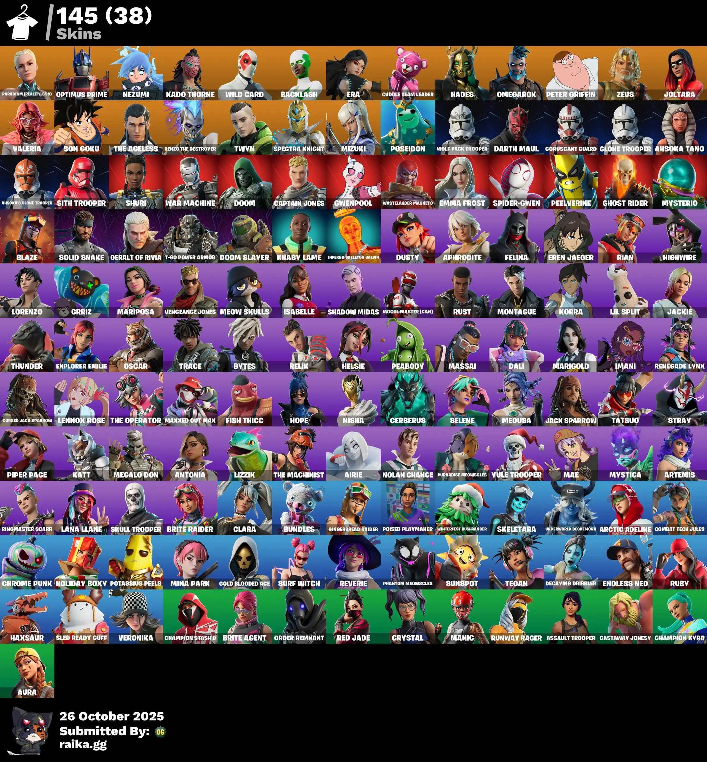 145 skins | Poseidon🎃Twyn🎃Kado Thorne🎃Renzo the Destroyer🎃Sith Troop🎃Son Goku🎃The Ageless🎃Omegarok🎃Valeria🎃Mizuki🎃Backlash🎃Joltara🎃Peter Griffin🎃Hades🎃Nezumi🎃Spectra Knight🎃Cuddle Team Leader🎃Zeus🎃Optimus Prime🎃Wild Card🎃Era D4995