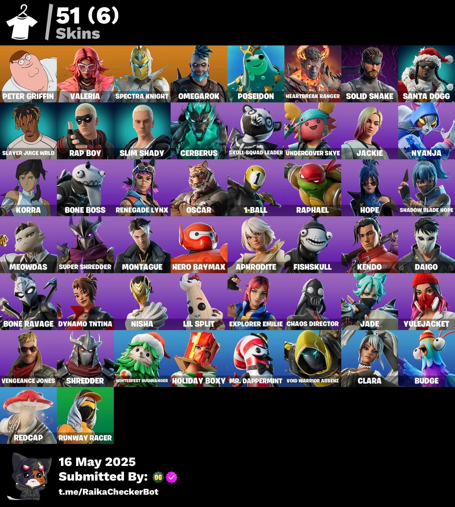 51 skins | Peter Griffin | Valeria | Spectra Knight | Omegarok | Poseidon | Heartbreak Ranger | Solid Snake | Santa Dogg | Slayer Juice WRLD | 500 VB | Nai@
