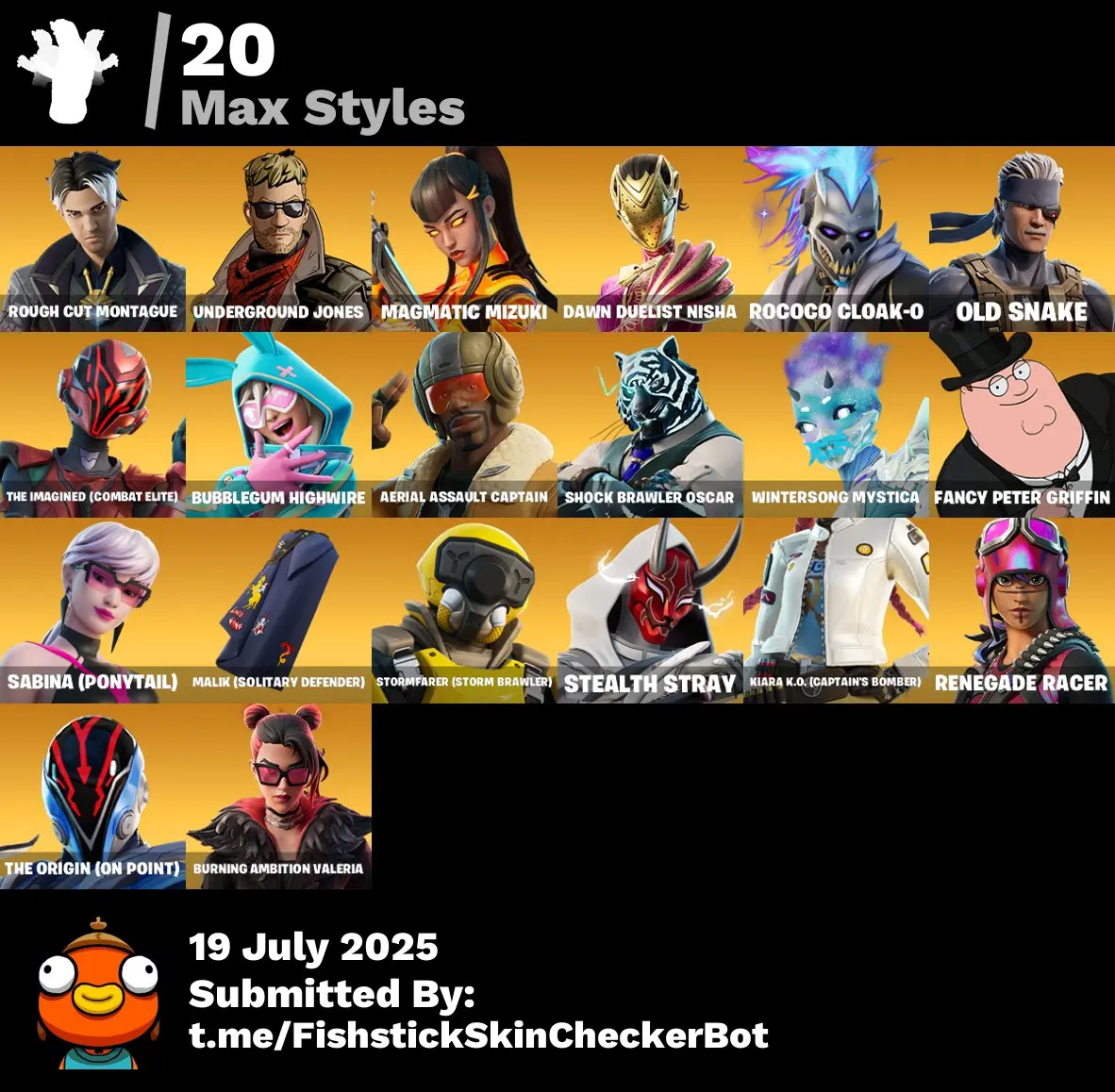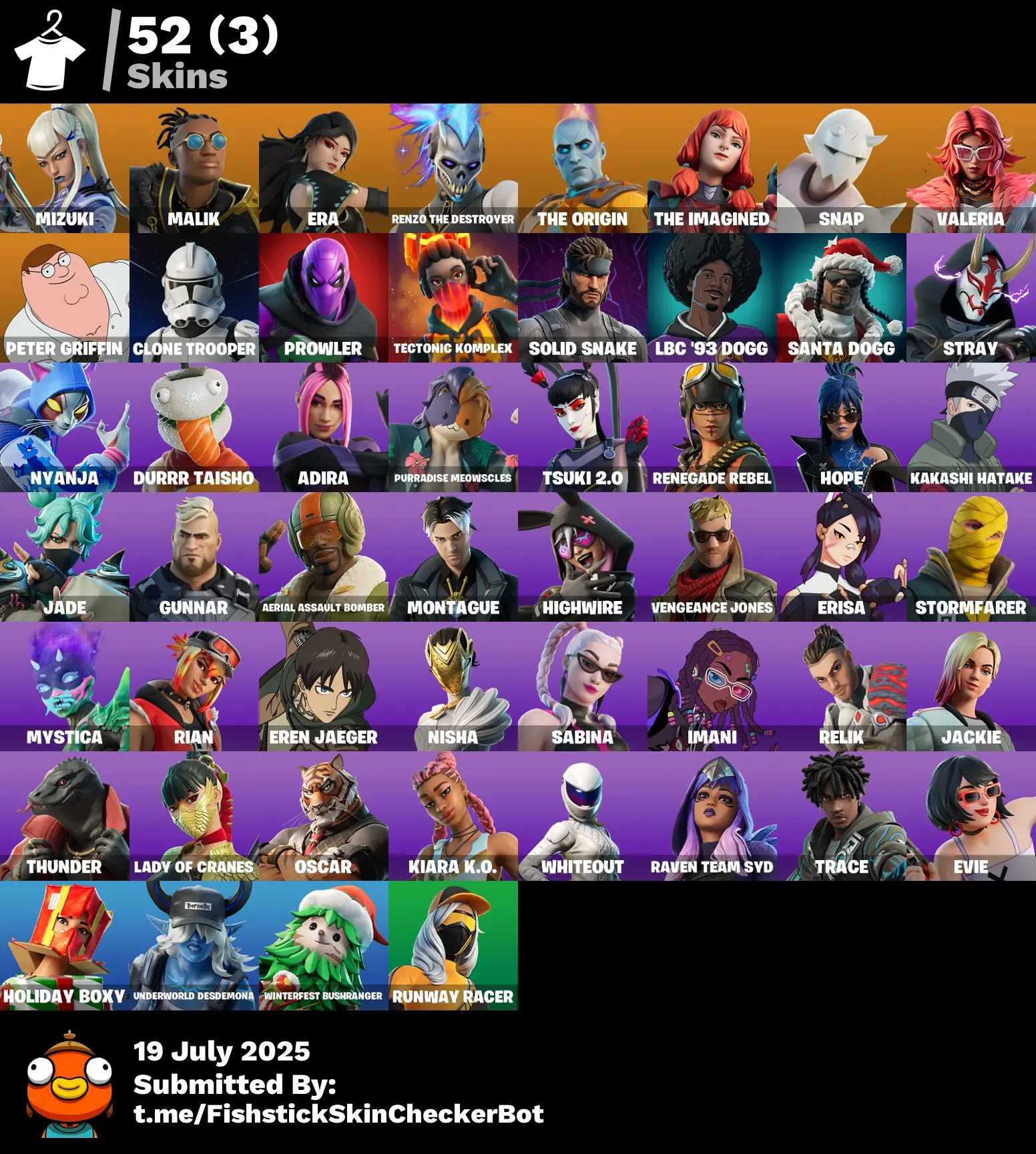 🎮 52 Skins [PC/PSN] 💫 Mizuki 🌀 Malik 🌸 Era ⚡ Renzo the Destroyer 🔮 The Origin 🌠 The Imagined 🌷 Valeria 🦸♂️ Peter Griffin 💂♂️ Clone Trooper 🏷️ FTN128