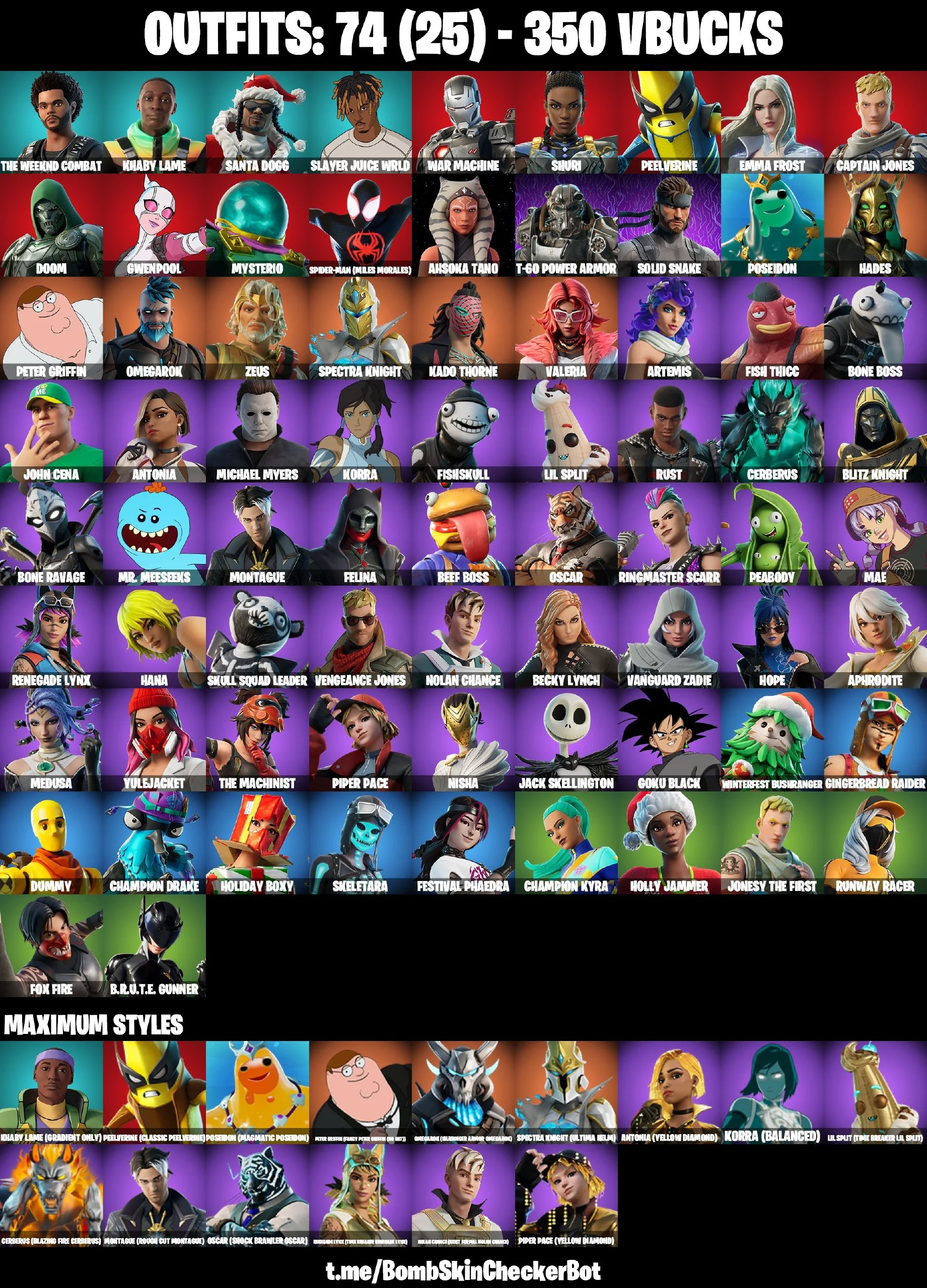 🔮74 Skins🔮 Khaby Lame💎Spiderman (Miles Morales)💎Goku Black💎Ashoka Tano💎Solid Snake💎Slayer Juice Wrld💎Holiday Boxy💎Winterfest Bushranger