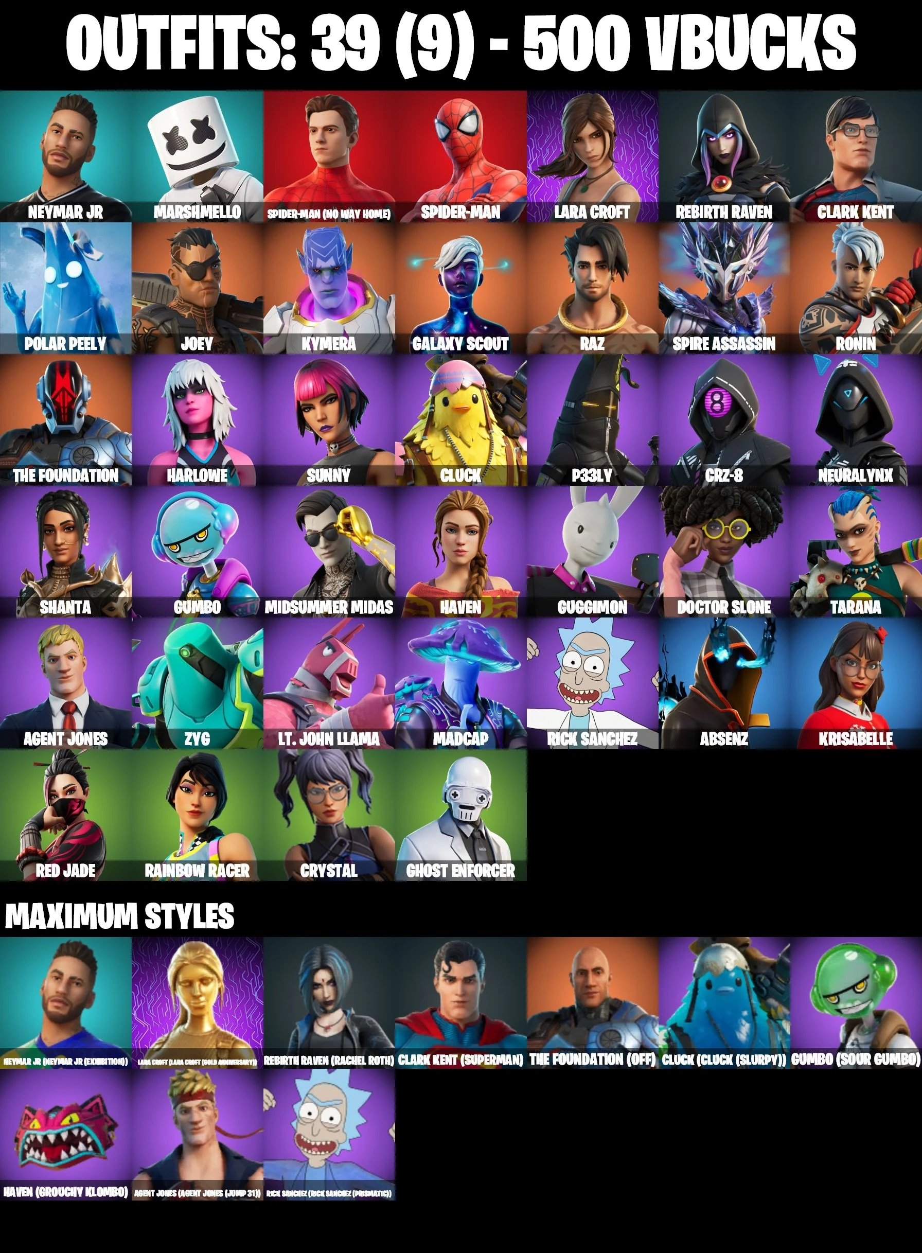 [ALL PLATFORMS] ⚡ 39 SKINS 💎 GOLD LARA CROFT 💜 RACHEL ROTH 💜 NEYMAR JR 💜 SPIDERMAN 💜 GALAXY SCOUT 💜 KRISABELLE 💜 CLARK KENT SUPERMAN ⚡ FULL ACCESS