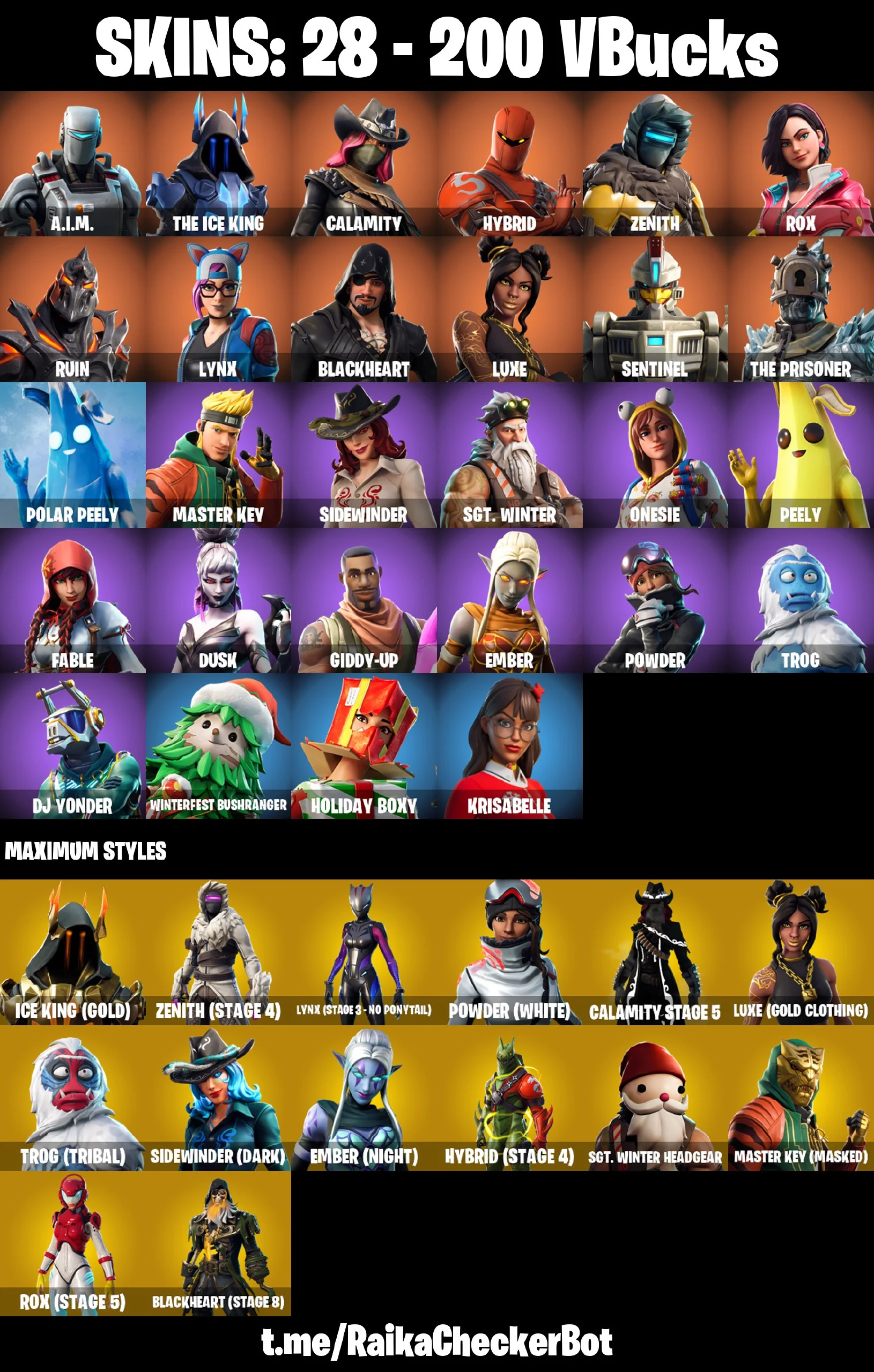 [PC] 🔥 28 ⭐️ skins 🔷 A.I.M. ⭐️ The Ice King ⭐️ Calamity ⭐️ Hybrid ⭐️ Zenith ⭐️ Rox ⭐️ Ruin ⭐️ Lynx ⭐️ Blackheart ⭐️ Luxe ⭐️ Sentinel ⭐️ The Prisoner ⭐️ A.I.M. ⭐️ The Ice King ⭐️ Calamity ⭐️ Hybrid