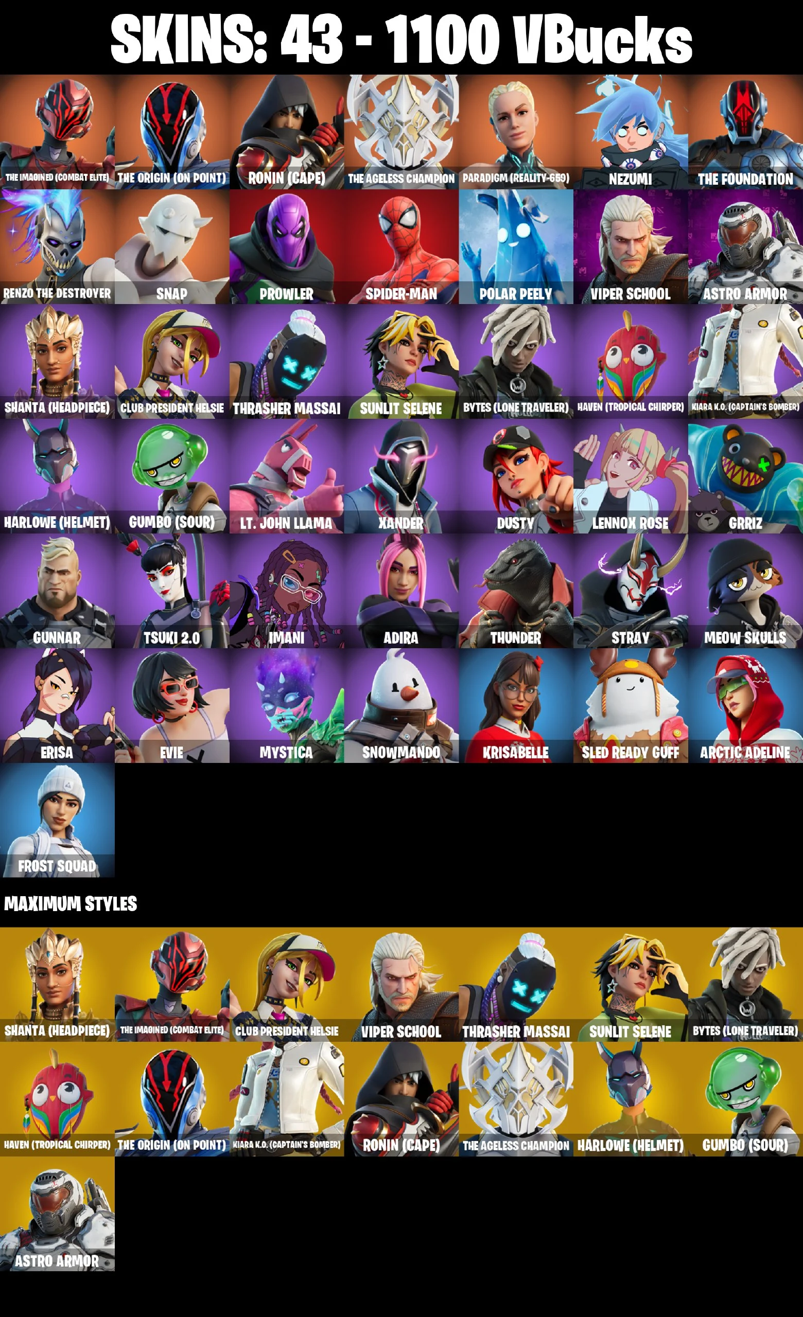 【PCNS/XBOX/PSN】 43 SKINS 🔥 THE IMAGINED (COMBAT ELITE) 🔥 THE ORIGIN (ON POINT) 🔥 RONIN (CAPE) 🔥 THE AGELESS CHAMPION 🔥 PARADIGM (REALITY-659) 🔥 NEZUMI 🔥 THE FOUNDATION 🔥 RENZO THE DESTROYER 🔥 SNAP 🔥 PROWLER 🔥 SPIDER-MAN 🔥 POLAR PEELY 🔥 VIP