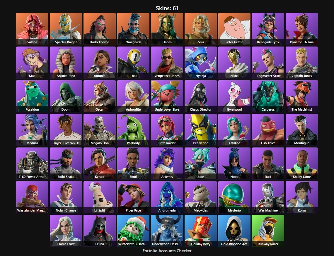 PC/PSN 61 Skins⚡ | Valeria | Spectra Knight | Kado Thorne | Omegarok | Hades | Zeus | Peter Griffin | Renegade Lynx | Dynamo TNTina | Mae | Ahsoka Tano
