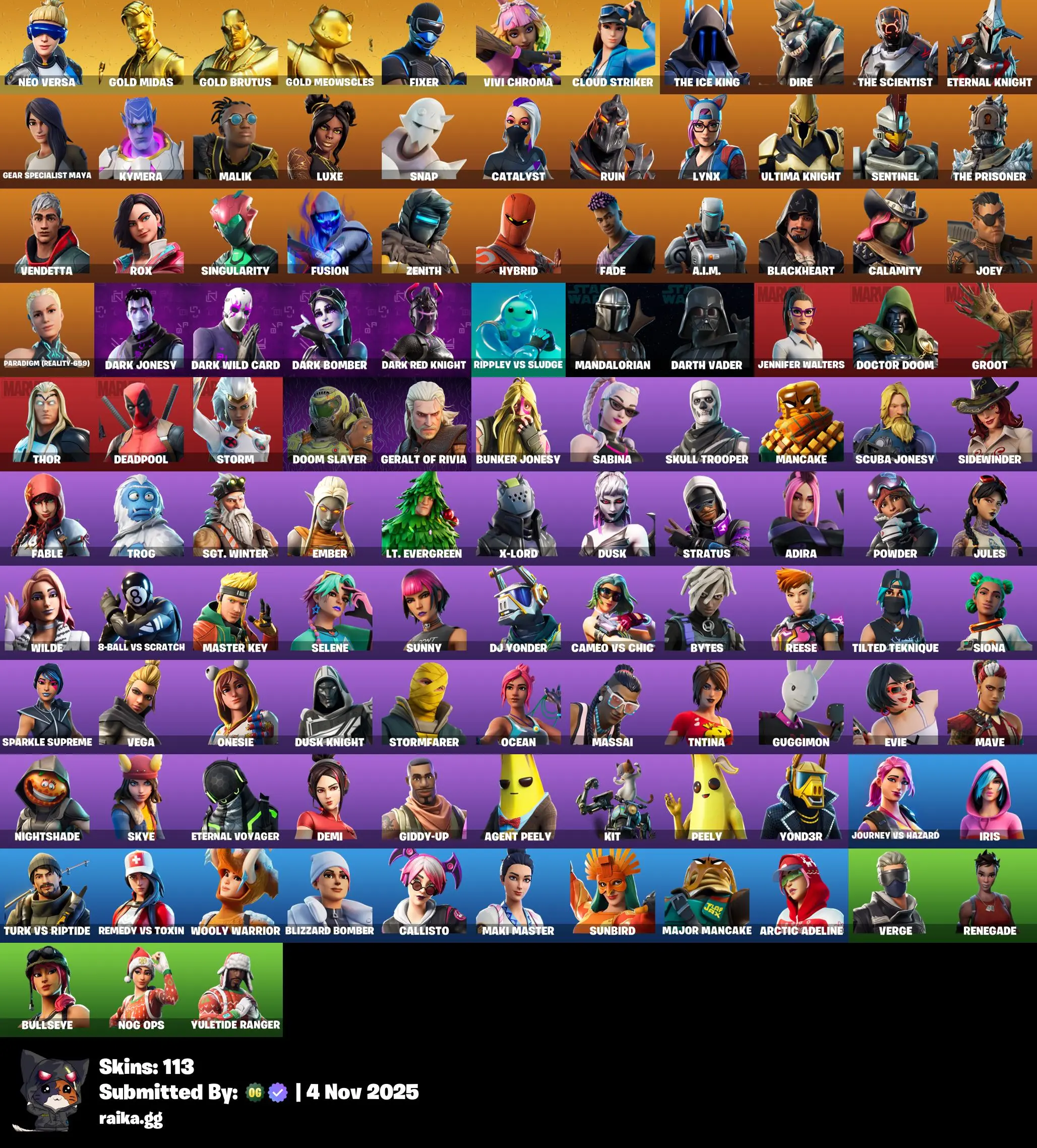 [PC/PSN/XBOX] 113 skins | Neo Versa | Gold Midas | Gold Brutus | Gold Meowscles | Fixer | Vivi Chroma | Cloud Striker | The Ice King | Dire | The Scientist | 1050 VB