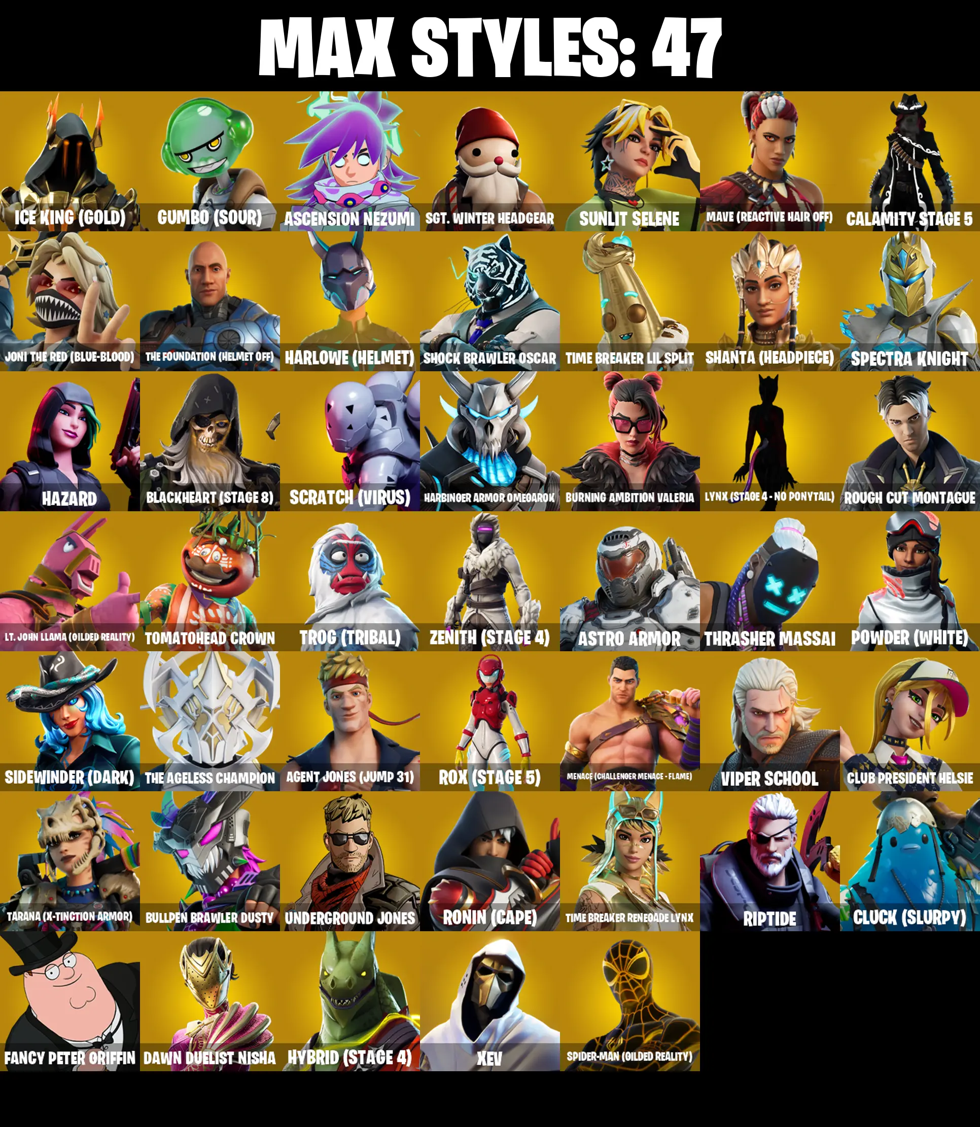 PC/PSN/XBOX ♨️136 skins ✨ Lara Croft ✨ Orange Justice ✨ The Ice King ✨ Alli ✨ Peely ✨ Fusion ✨ Spider-Man ✨ Menace ✨ The Ageless ✨ Lynx ✨ #B738