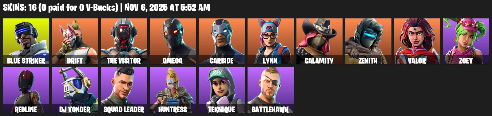 [PC/PSN/XBOX] | 16 skins | Omega | Blue Striker | Drift | The Visitor | Carbide | Lynx | Calamity | Zenith | Valor | Zoey | Redline | DJ Yonder | S4G