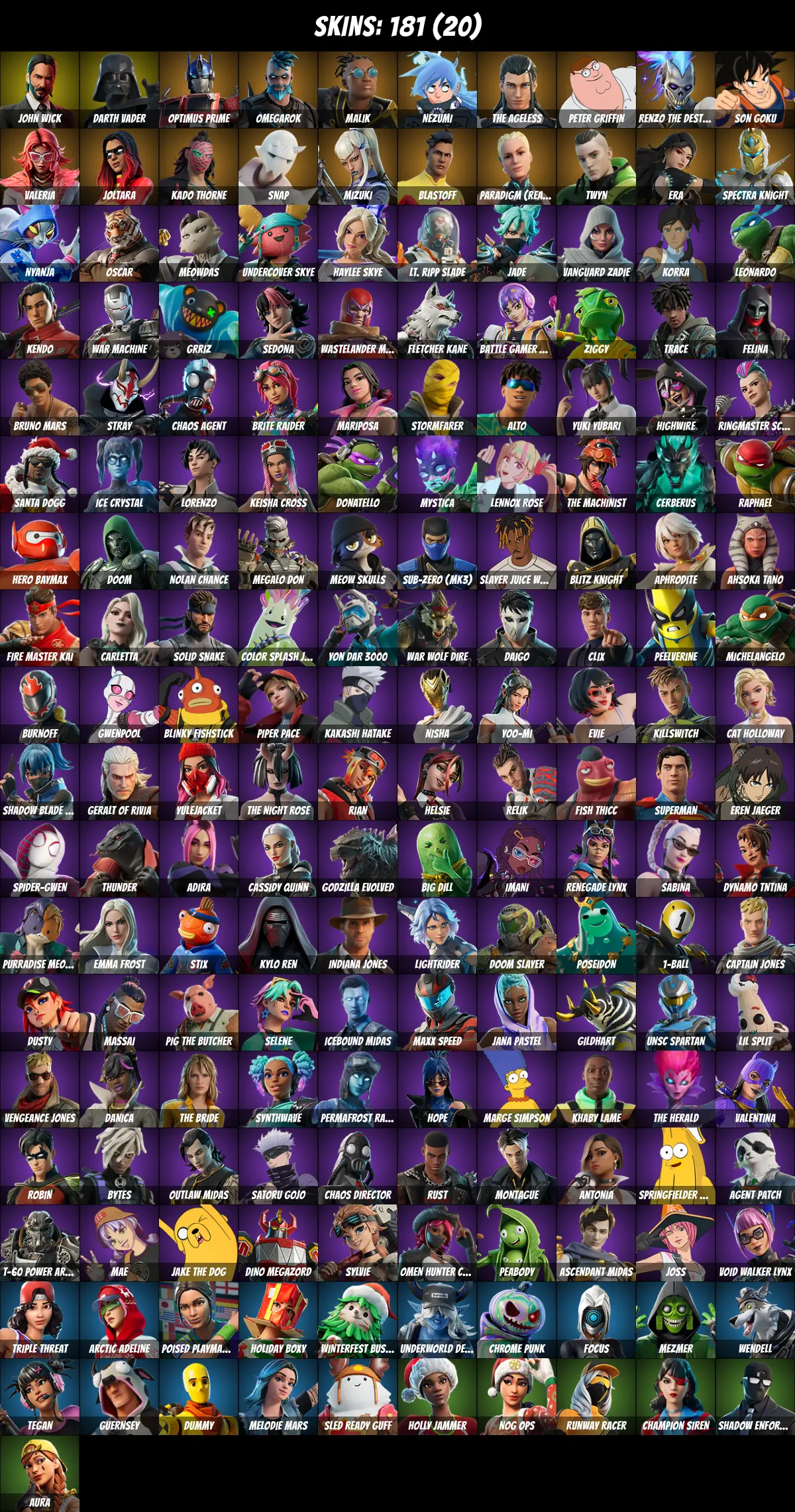⚡PC/PSN/XBOX⚡ 181 skins 💎 John Wick 💎 Gwenpool 💎 Joltara 💎 Spider-Gwen 💎 Darth Vader 💎 Aura 💎 Focus 💎 Son Goku 💎 The Ageless 💎 Kakashi Hatake 💎 Satoru Gojo 💎 Renzo the Destroyer 💎 Dummy 💎 Kylo Ren 💎 Snap 💎 Peelverine 💎 Optimus Prime 💎 1400 V-Bucks 💎