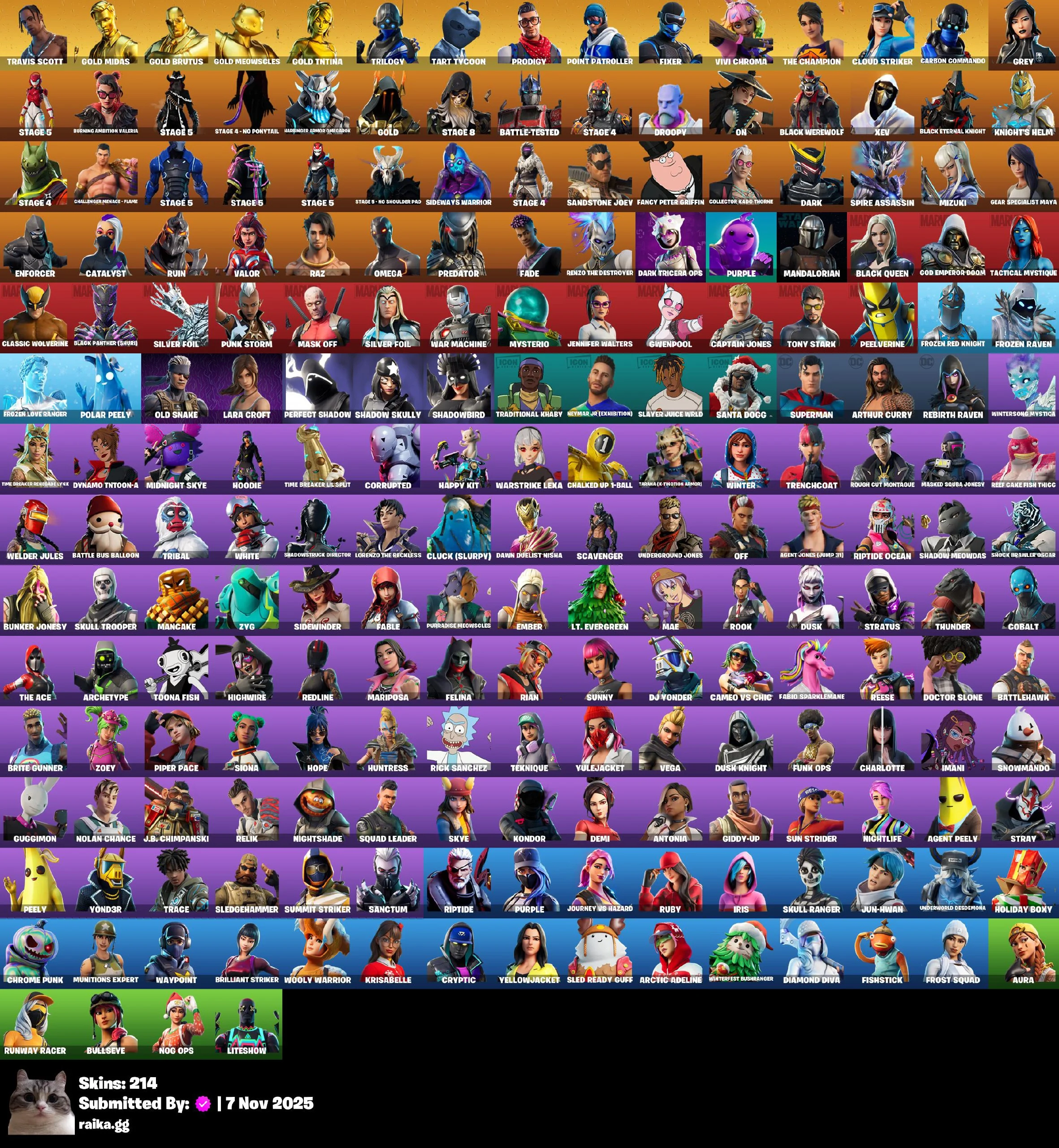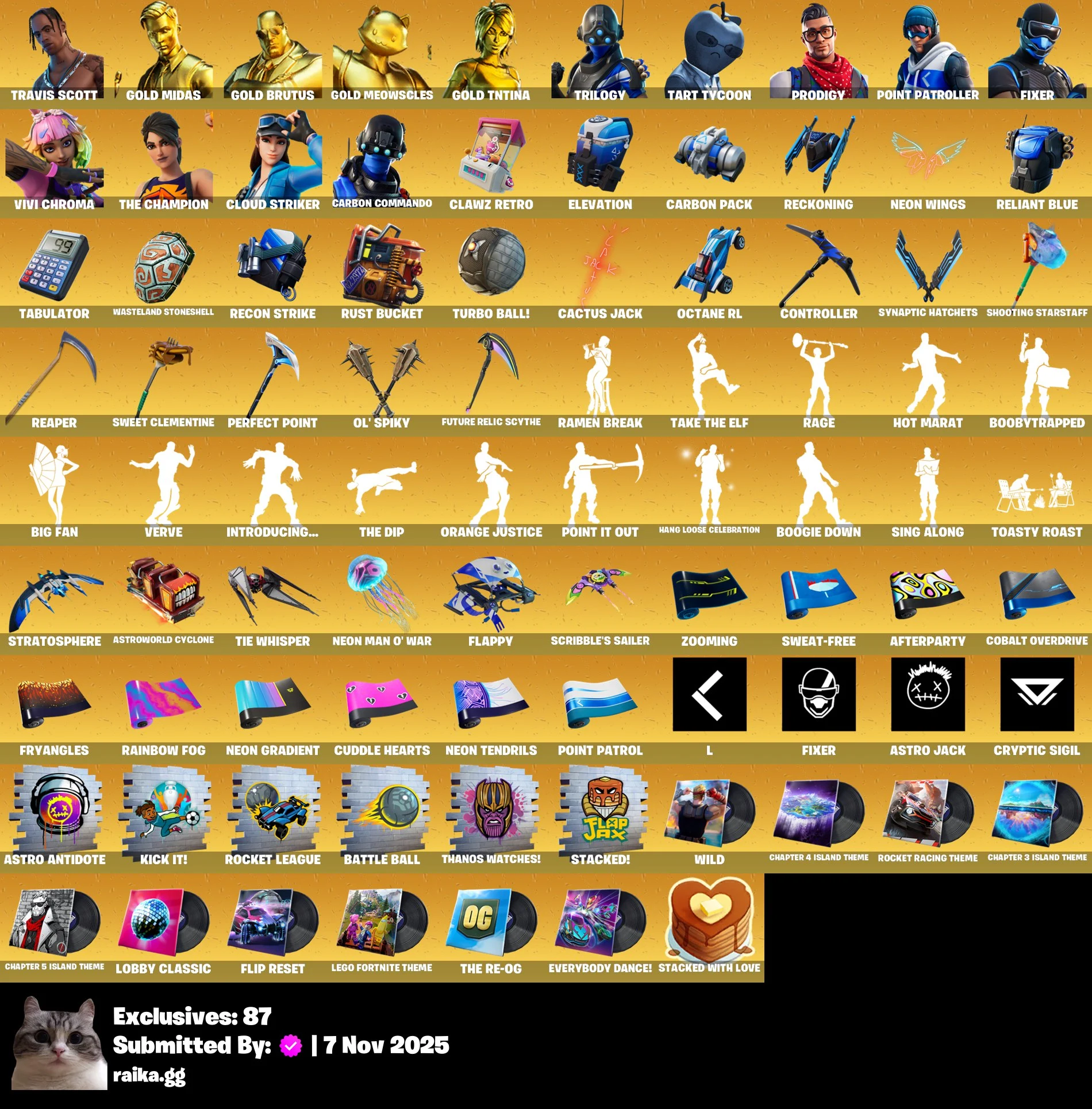 [PC/PSN/XBOX] 214 skins | Travis Scott | Gold Midas | Gold Brutus | Gold Meowscles | Gold TNTina | Trilogy | Tart Tycoon | Prodigy | Point Patroller |