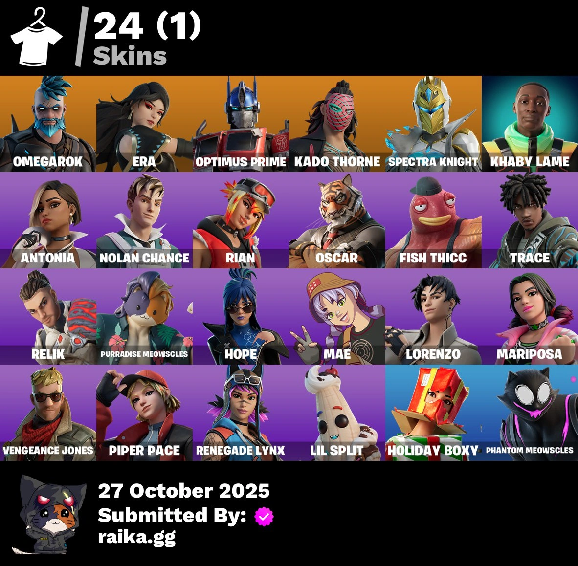 [PC/PSN/XBOX] 24 skins | Omegarok | Era | Optimus Prime | Kado Thorne | Spectra Knight | Khaby Lame | Antonia | Nolan Chance | Rian | Oscar | Fish Thicc | 200 VB