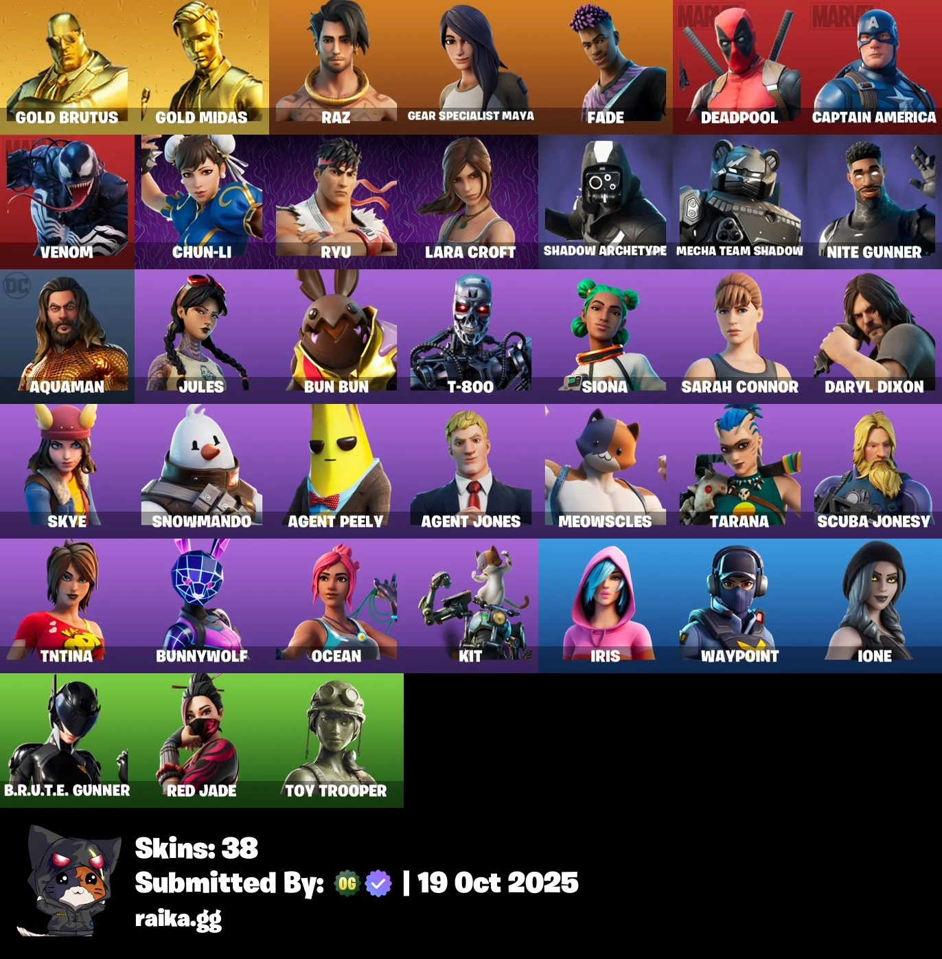 [PC/PSN/XBOX] 38 skins | Gold Brutus | Gold Midas | Raz | Gear Specialist Maya | Fade | Deadpool | Captain America | Venom | Chun-Li | Ryu | Lara Croft | 200 VB