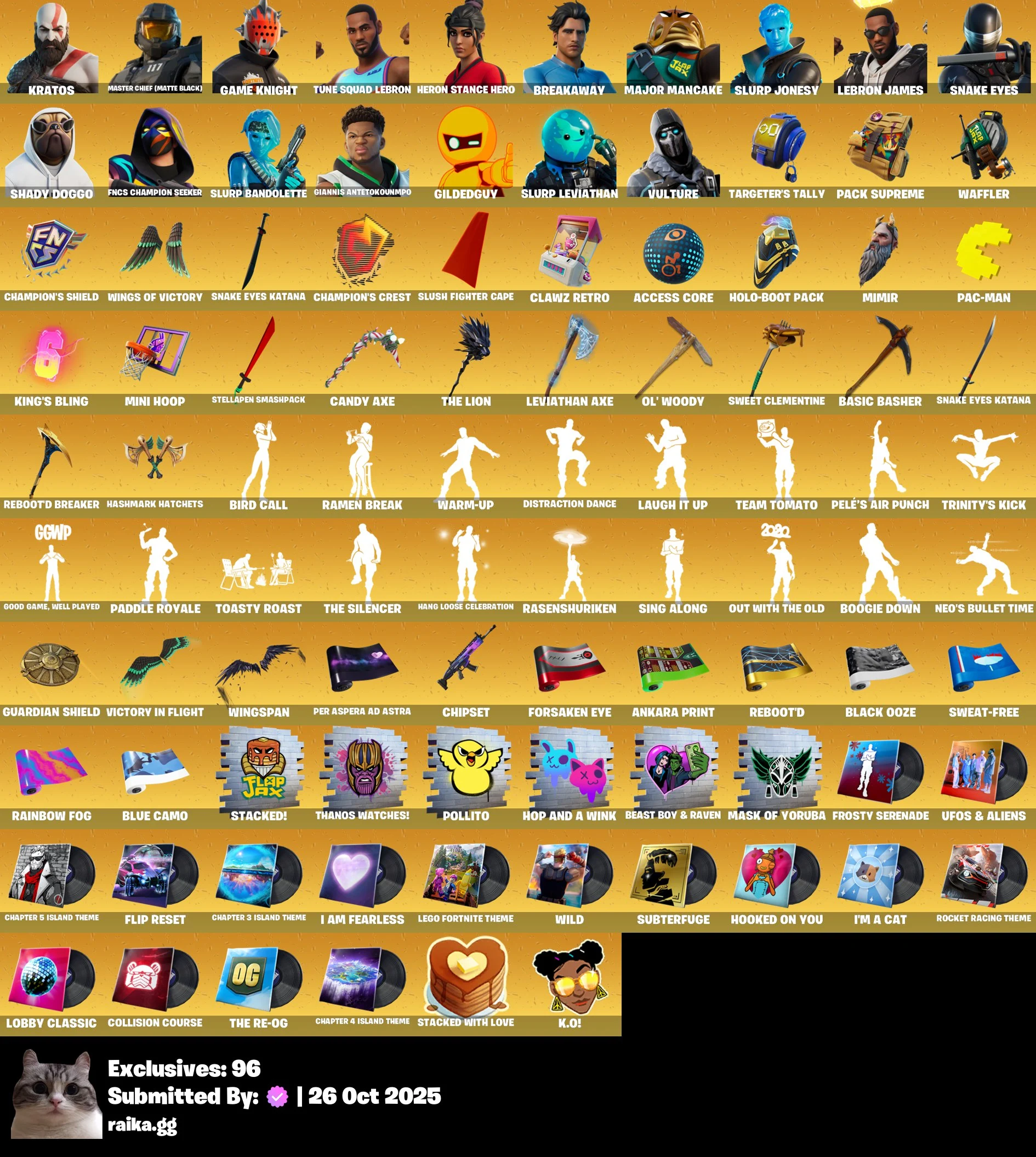 [PC/PSN/XBOX] 421 skins | Leviathan Axe | Renegade Raider | Kratos | Master Chief (Matte Black) | Game Knight | Heron Stance Hero | Snake Eyes | Shady Doggo | 450 VB