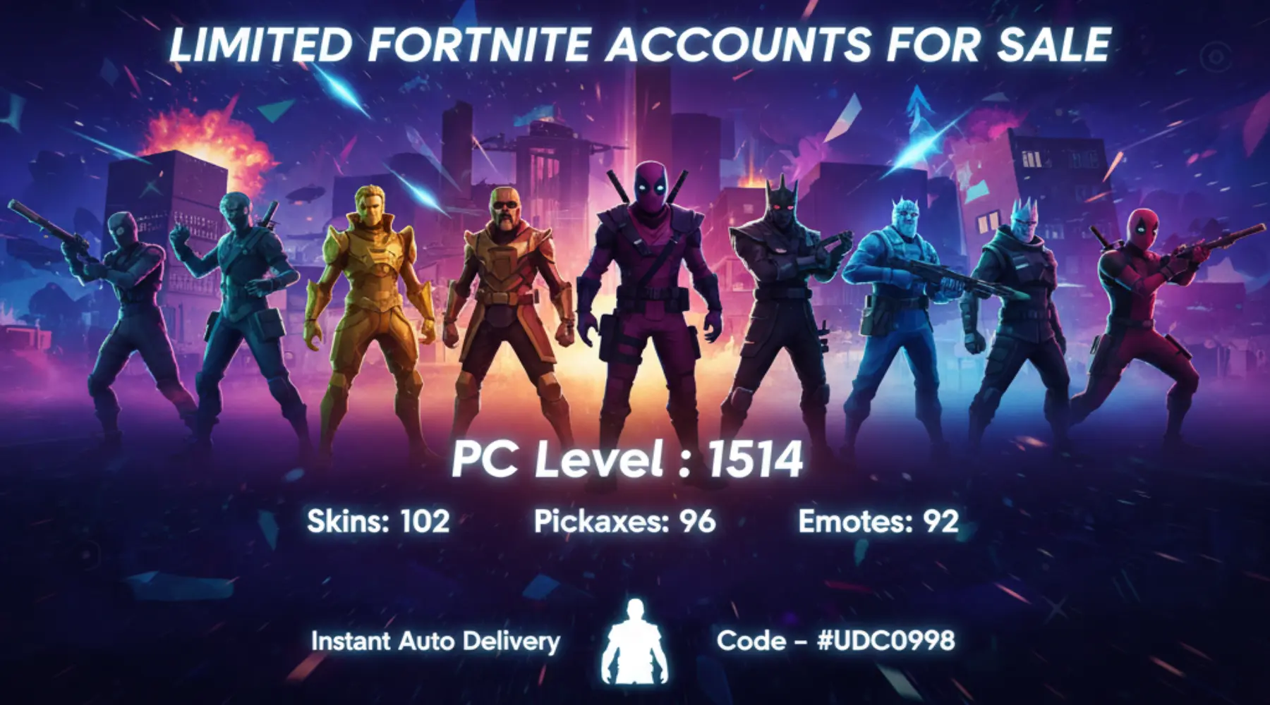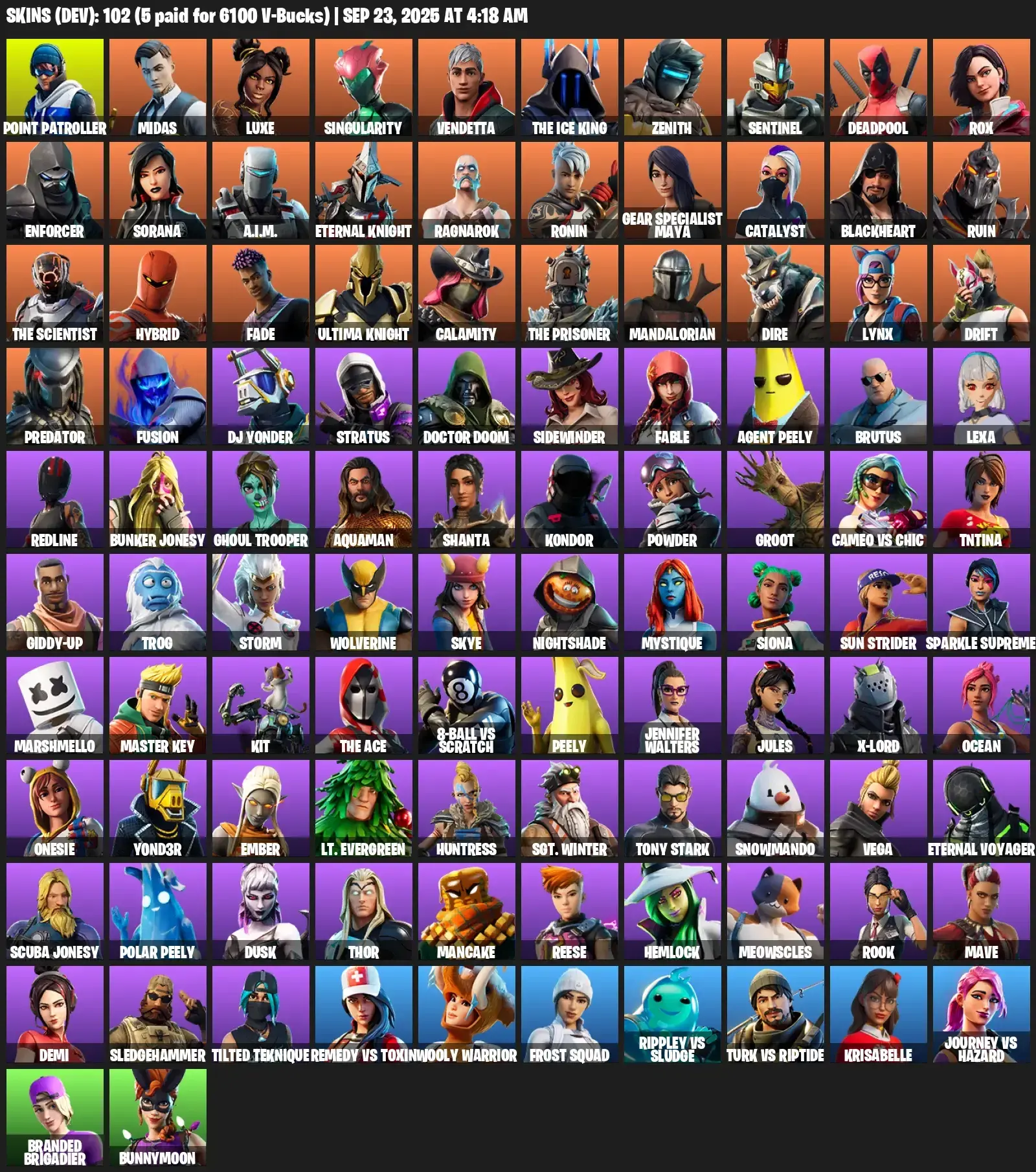 [PC/PSN/XBOX] | 102 skins | Point Patroller | Midas | Luxe | Singularity | Vendetta | The Ice King | Zenith | Sentinel | Deadpool | #UDC0998 | #MBFN