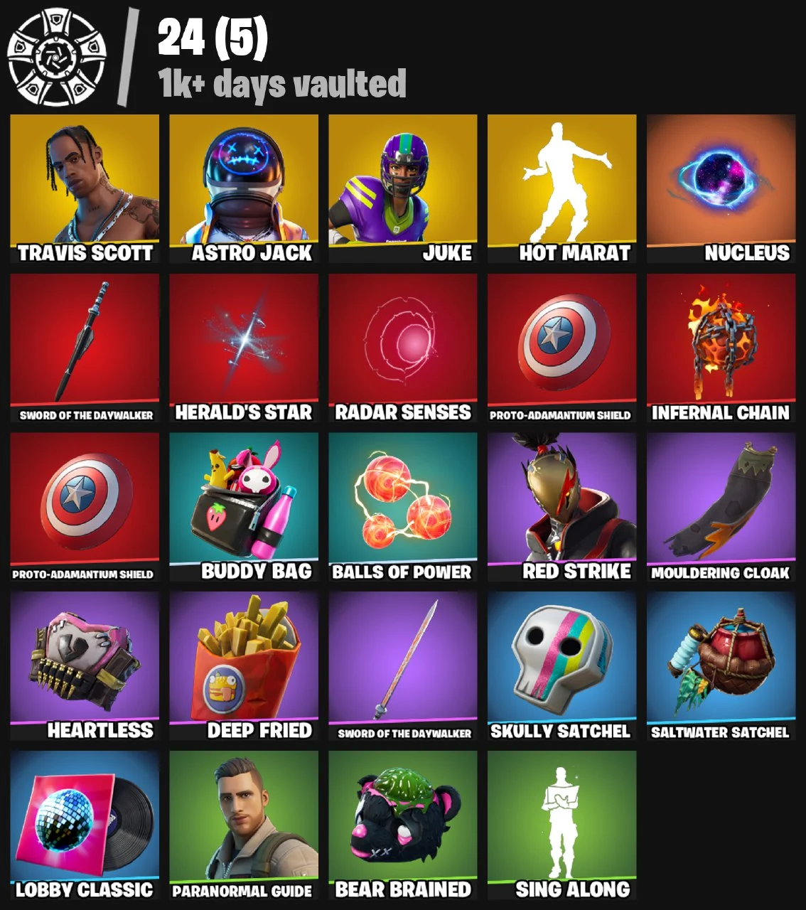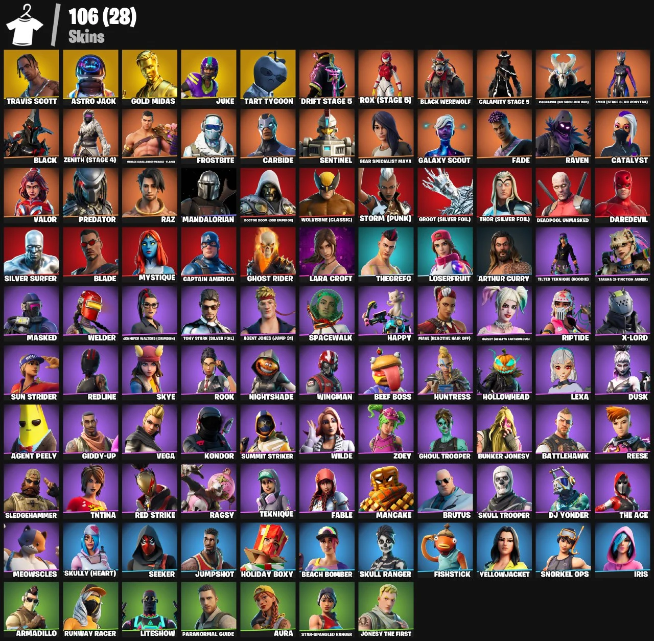 ⭕PC/PSN/XBOX⭕106 Skins + Travis Scott + ASTRO JACK + Drift + Calamity + Lynx + IRIS + Yellowjacket + Gold Midas + Aura + HARLEY HITTER + Orange Justice + Juke + Red Strike + Tart Tycoon | -4280 V-Bucks
