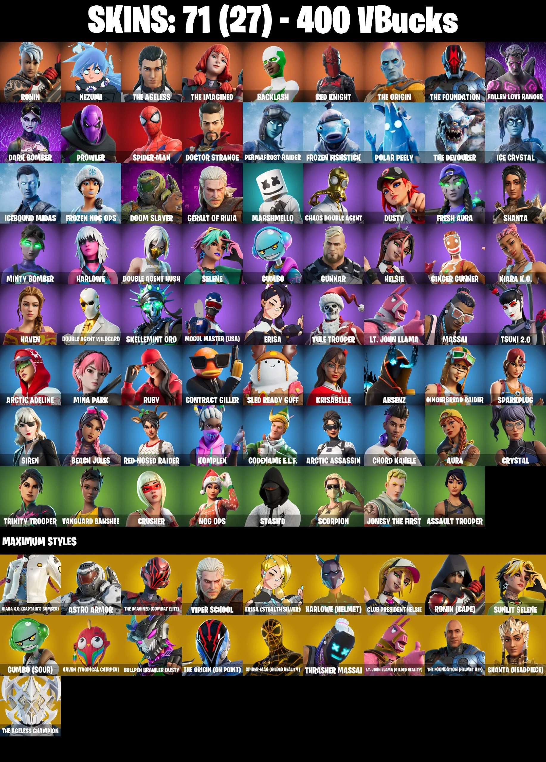 ⭐ [PC/PSN/XBOX/NINTENDO/MOBILE] 71 SKINS | RED KNIGHT | BACKLASH | FALLEN LOVE RANGER | DARK BOMBER | SPIDER-MAN | DOCTOR STRANGE | MARSHMELLO | YULE TROOPER | FRESH AURA | GINGER GUNNER | MOGUL MASTER USA | MINTY BOMBER | HELSIE | 400 VBUCKS | EMAIL