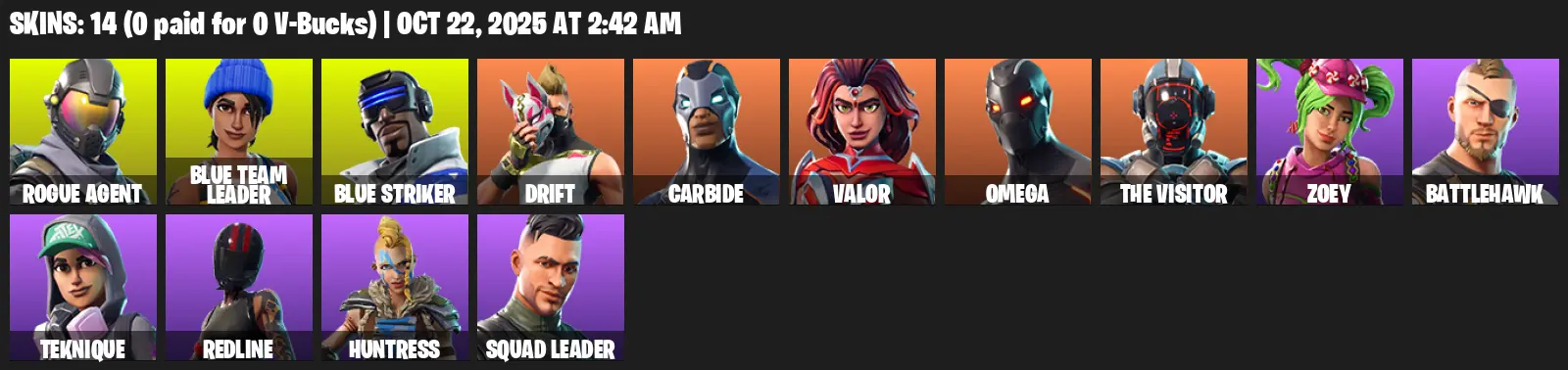 [PC/XBOX] | 14 skins | Omega | Rogue Agent | Blue Team Leader | Blue Striker | Drift | Carbide | Valor | The Visitor | Zoey | Battlehawk | S4G