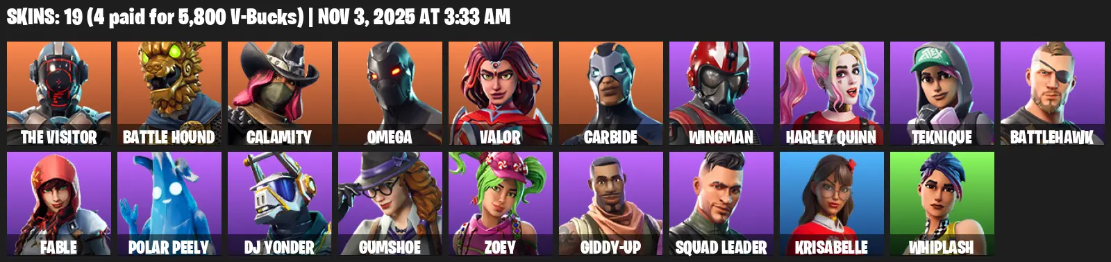 [PC/XBOX] | 19 skins | Omega | The Visitor | Battle Hound | Calamity | Valor | Carbide | Wingman | Harley Quinn | Teknique | Battlehawk | Fable | S4G