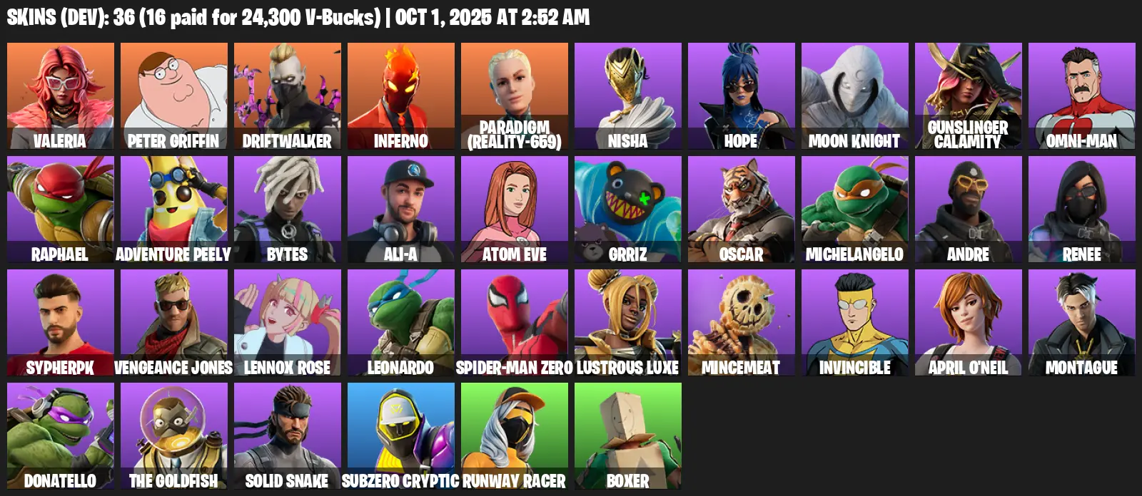 PC/XBOX 36 Skins⚡ | Valeria | Peter Griffin | Driftwalker | Inferno | Paradigm (Reality-659) | Nisha | Hope | Moon Knight | Gunslinger Calamity | Omni-Man
