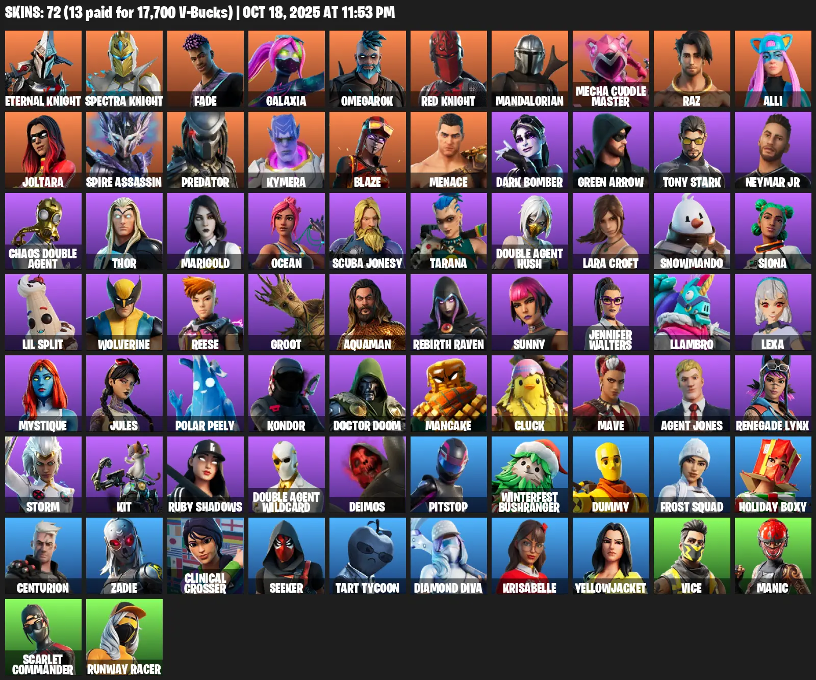 [PC/XBOX] 72 Skins | Eternal Knight | Spectra Knight | Fade | Galaxia | Omegarok | Red Knight | Mandalorian | Mecha Cuddle Master | Raz | Alli | Joltara | Spire Assassin | Predator | Kymera | Blaze | Menace | Dark Bomber | Green Arrow | Tony Stark